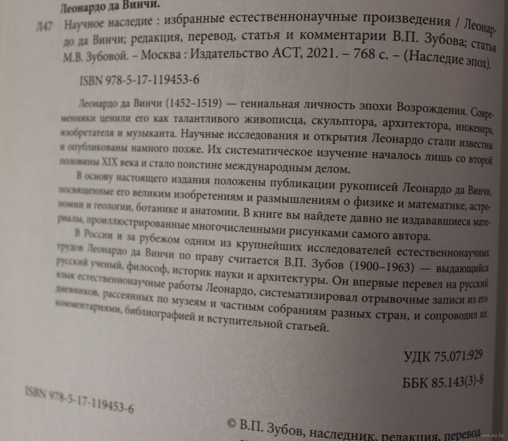 В России и за рубежом одним из крупнейших исследователей естественнонаучных трудов Леонардо да Винчи по праву считается В.П. Зубов (1900–1963) – выдающийся русский ученый, философ, историк науки и архитектуры. Он впервые перевел на русский язык естественнонаучные работы Леонардо, систематизировал отрывочные записи из его дневников, рассеянных по музеям и частным собраниям разных стран, и сопроводил их комментариями, библиографией и вступительной статьей.