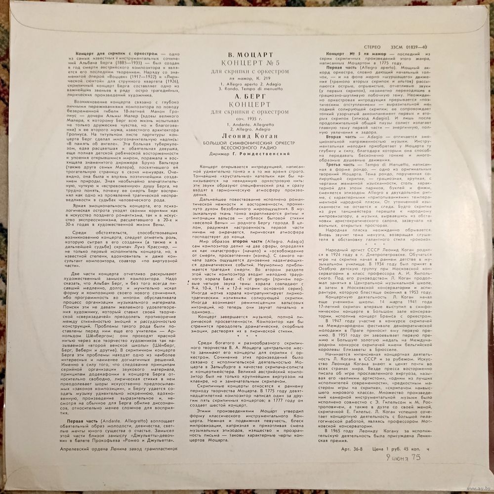 Леонид Коган - В. Моцарт / А. Берг – Концерт 5 Для Скрипки С Оркестром Ля Мажор, К. 219 / Концерт Для Скрипки С Оркестром, Соч. 1935 г.