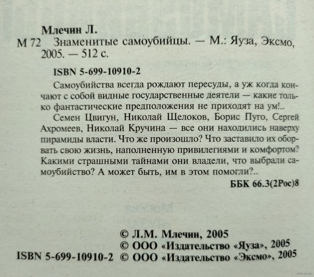 Леонид Млечин. Знаменитые самоубийцы. Москва: Яуза, Эксмо, 2005г., 511c. Твёрдый переплёт. Обычный формат.