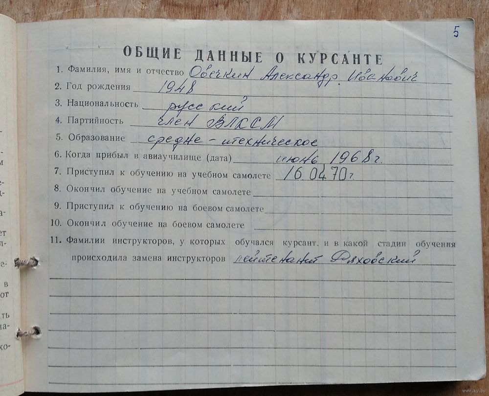 Летная книжка курсанта Ставропольского высшего военно-авиационного училища лётчиков и штурманов