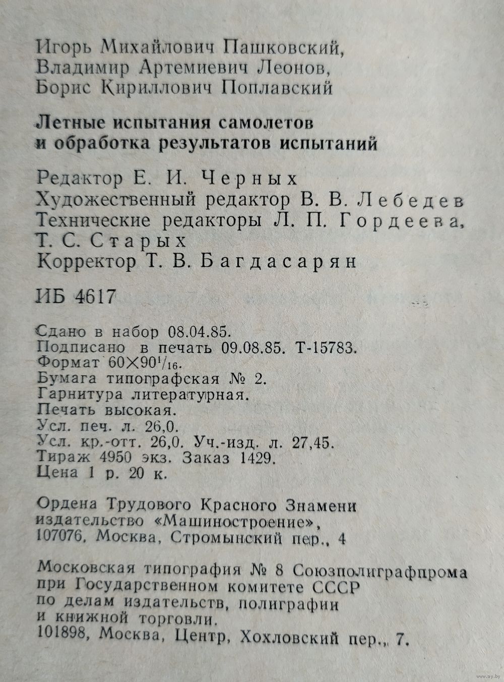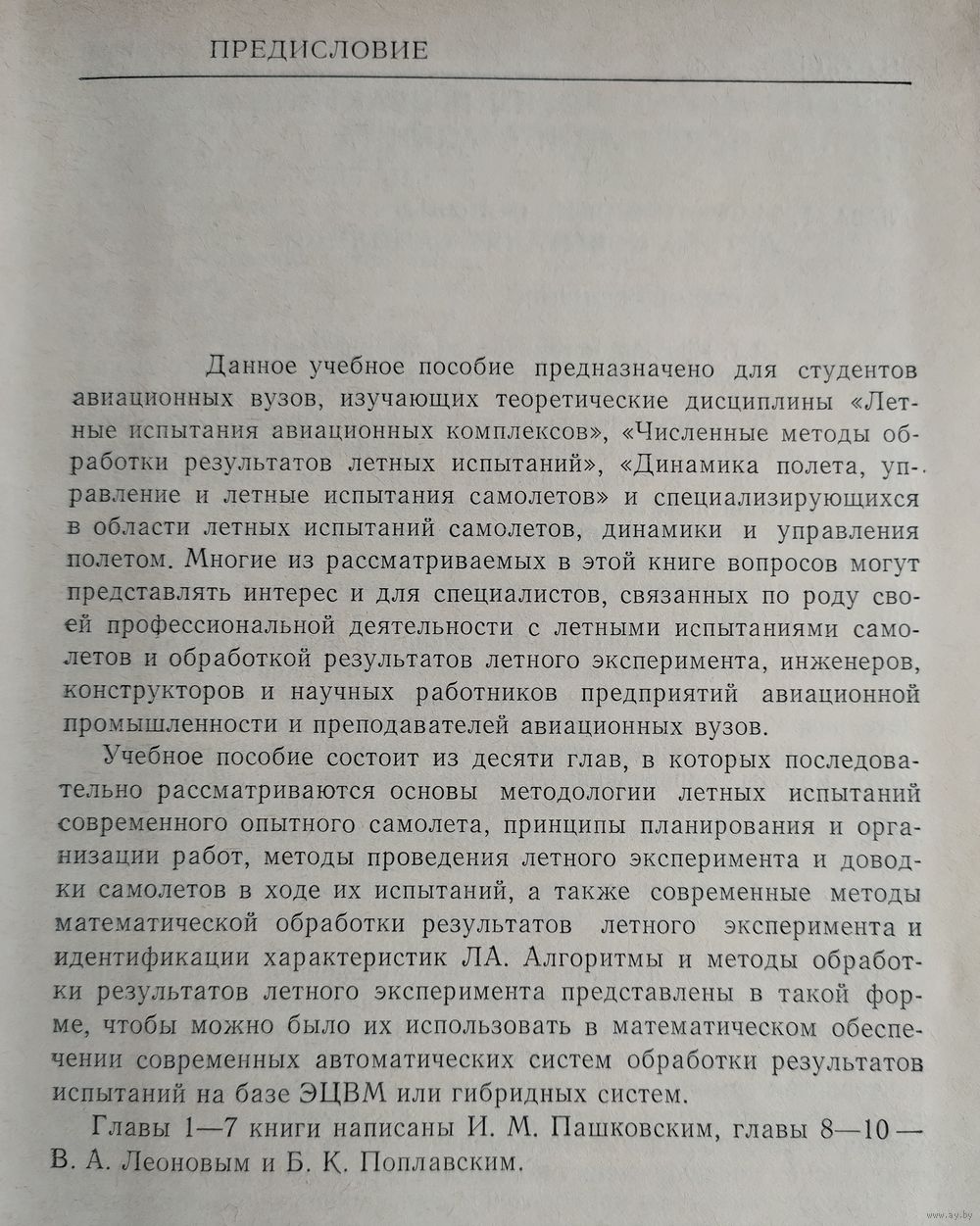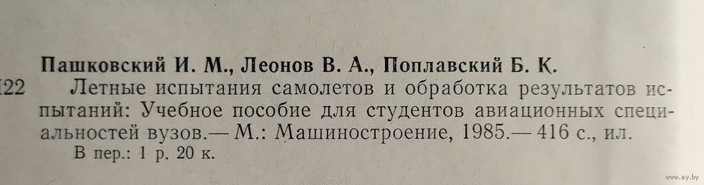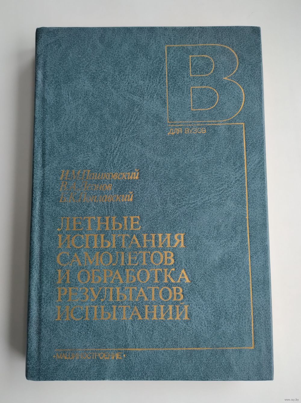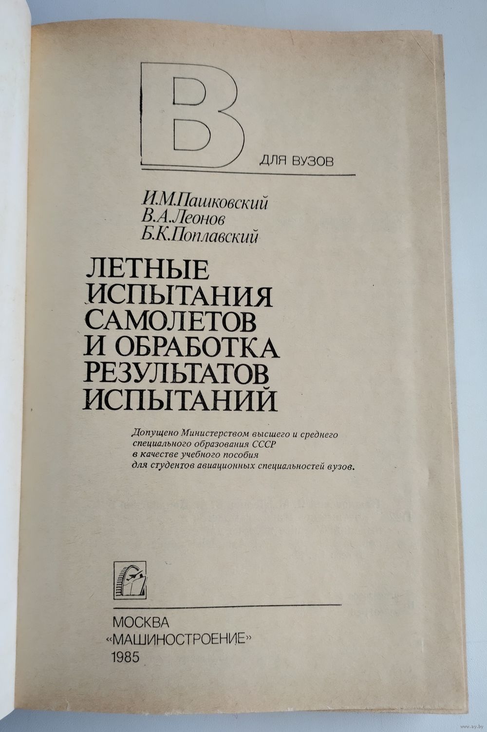 Пашковский И. М., Леонов В. А., Поплавский Б. К. Лётные испытания самолетов и обработка результатов испытаний. Учебное пособие для студентов авиационных специальностей вузов. М.: Машиностроение, 1985 г., 416с. Твёрдый переплёт. Обычный формат. Малый тираж - 4950 экз.