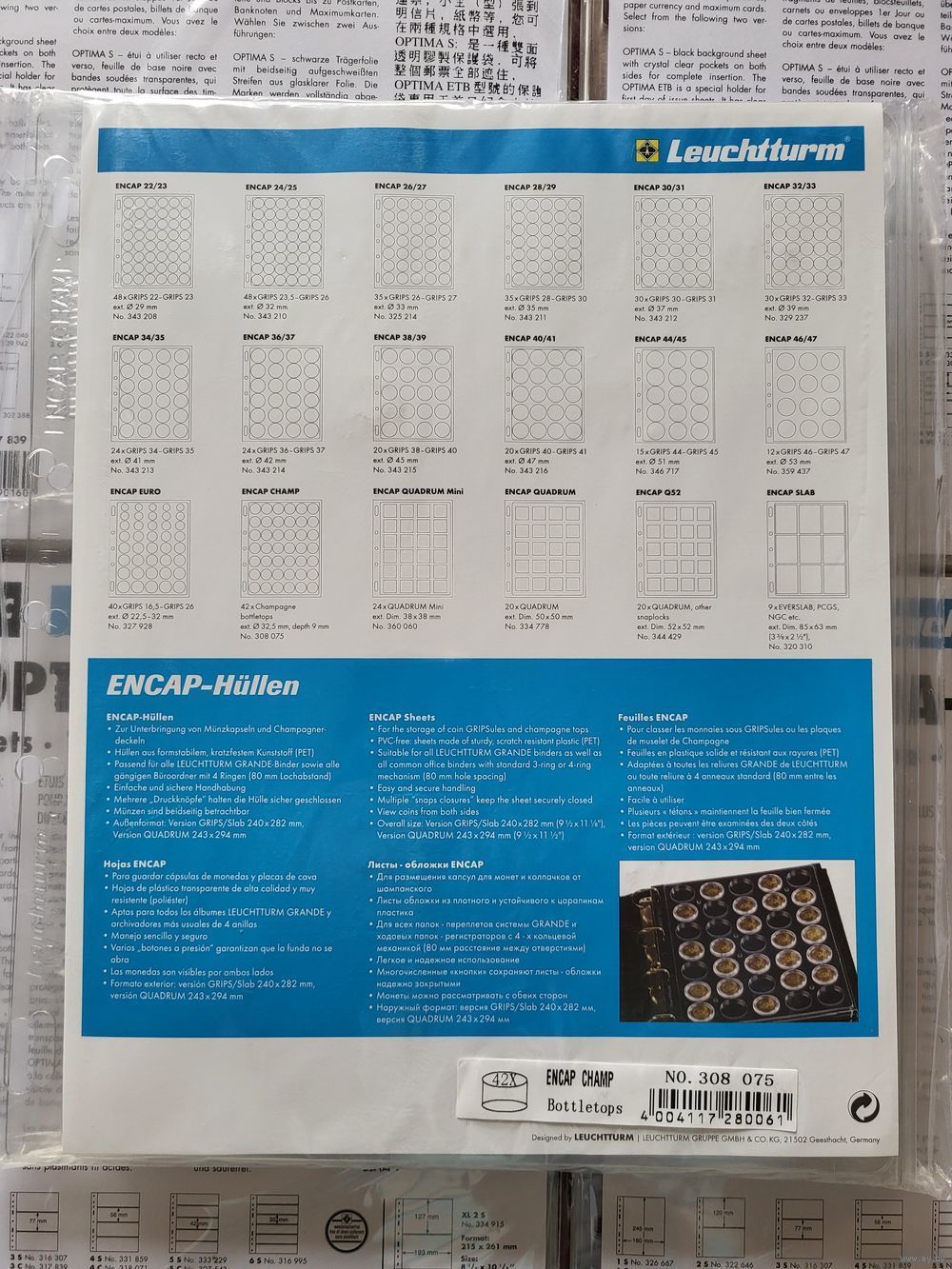 Leuchtturm ENCAP CHAMP листы для пивных крышек на 42 ячейки 32,5x9 мм! Целая упаковка! Leuchtturm Grande M20! Пачка 2 шт! Германия, Лёйхтурм, Leuchtturm! ВОЗМОЖЕН ОБМЕН!