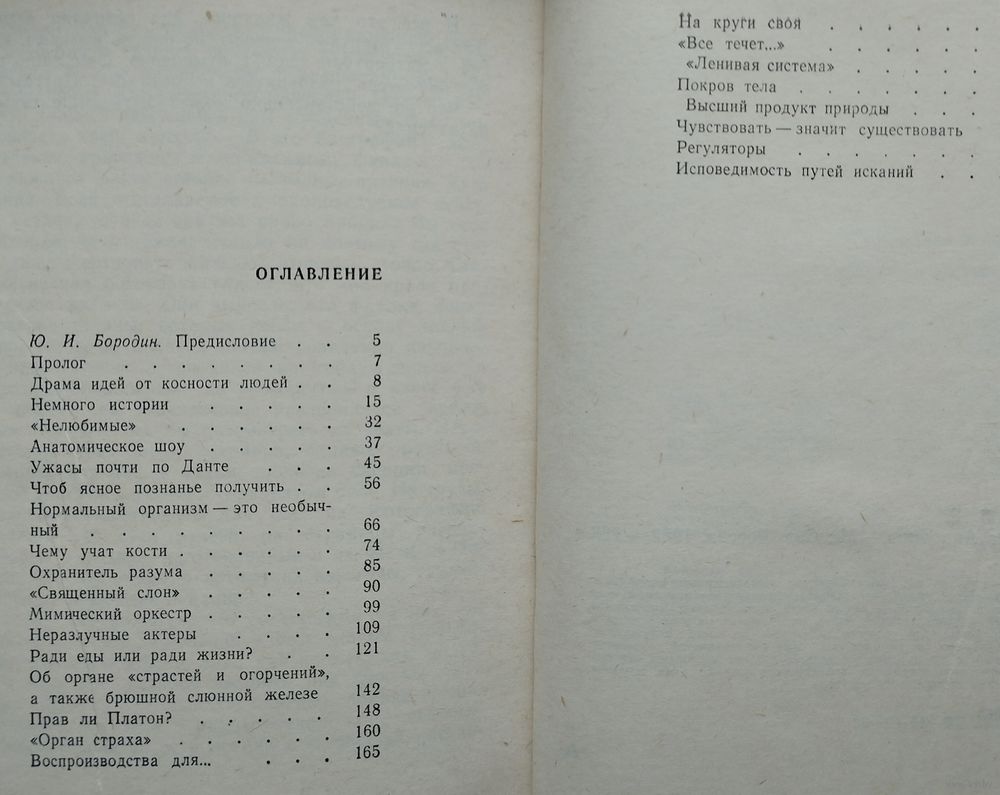 Тираж 50000 экз. 288 стр. Автор — один из известных анатомов нашей страны, опираясь на работы крупнейших ученых, рассказывает о развитии анатомии, о ее современных достижениях, о деятельности отечественных морфологов. В популярной и увлекательной форме он знакомит читателей с принципами устройства тела человека, влиянием на него окружающей среды, работой его систем (нервной, сердечно-сосудистой, пищеварительной и др.), с некоторыми все еще не ясными вопросами деятельности человеческого организма, исследуемого уже не одно столетие.