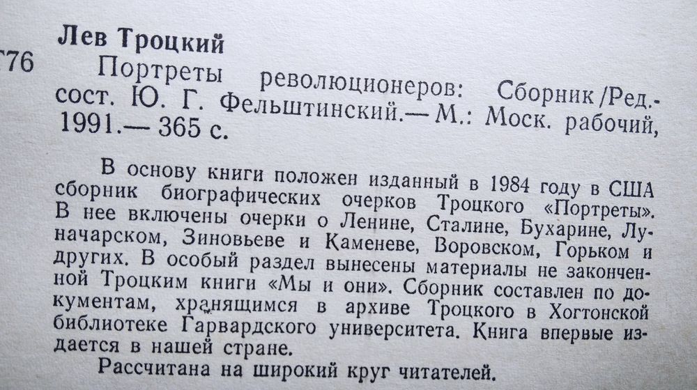 В основу книги положен изданный в 1984 году в США сборник биографических очерков Троцкого «Портреты». В нее включены очерки о Ленине, Сталине, Бухарине, Луначарском, Зиновьеве, Каменеве, Воровском, Горьком и др. В особый раздел вынесены материалы не законченной Троцким книги «Мы и они». Сборник составлен по документам, хранящимся в архиве Троцкого в Хогтонской библиотеке Гарвардского университета. Книга впервые издается в нашей стране. Рассчитана на широкий круг читателей.
