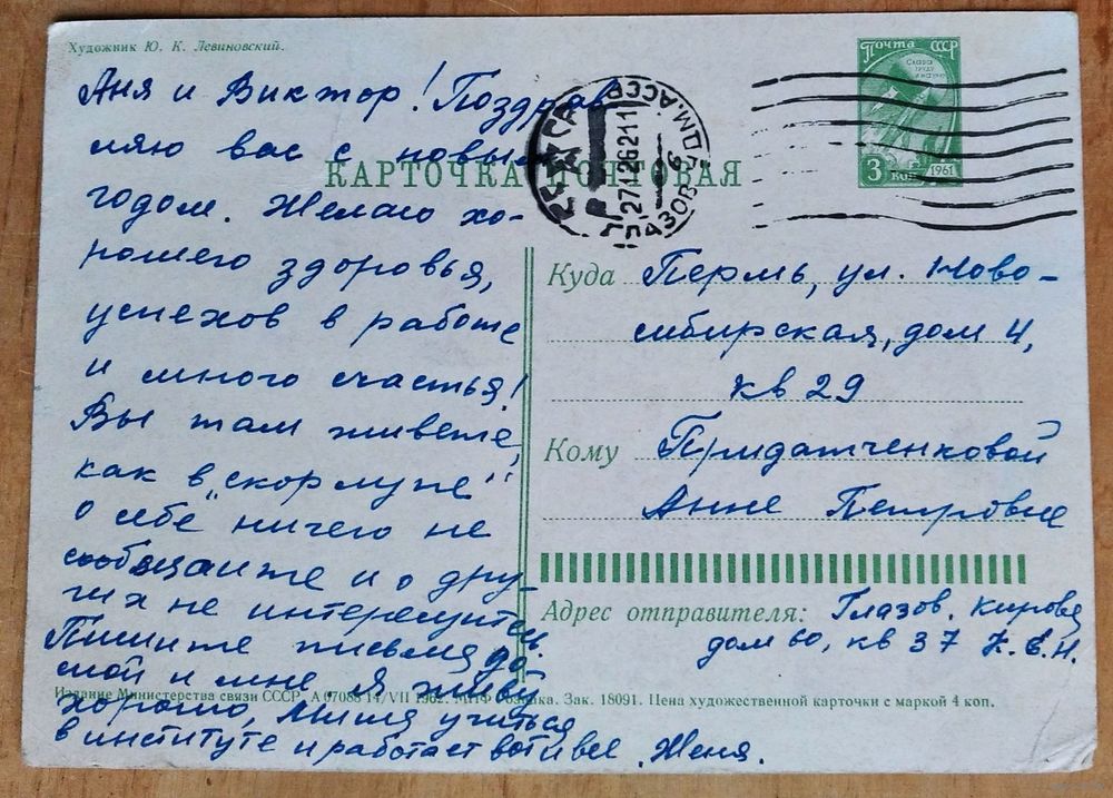 Левиновский Ю. С Новым годом! 1962 г. ПК. Прошла почту.