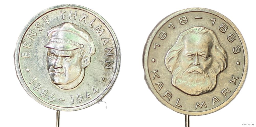 Левый значок с портретом Эрнста Тельмана, лидера Коммунистической партии Германии, 1886-1944. Правый значок с портретом Карла Маркса 1818-1883