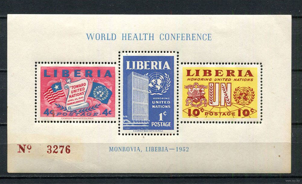 Либерия - 1952 - ООН - (пожелтевший клей) - [Mi. bl. 5A] - 1 блок. MH. (Лот 36Jo)-T4P18