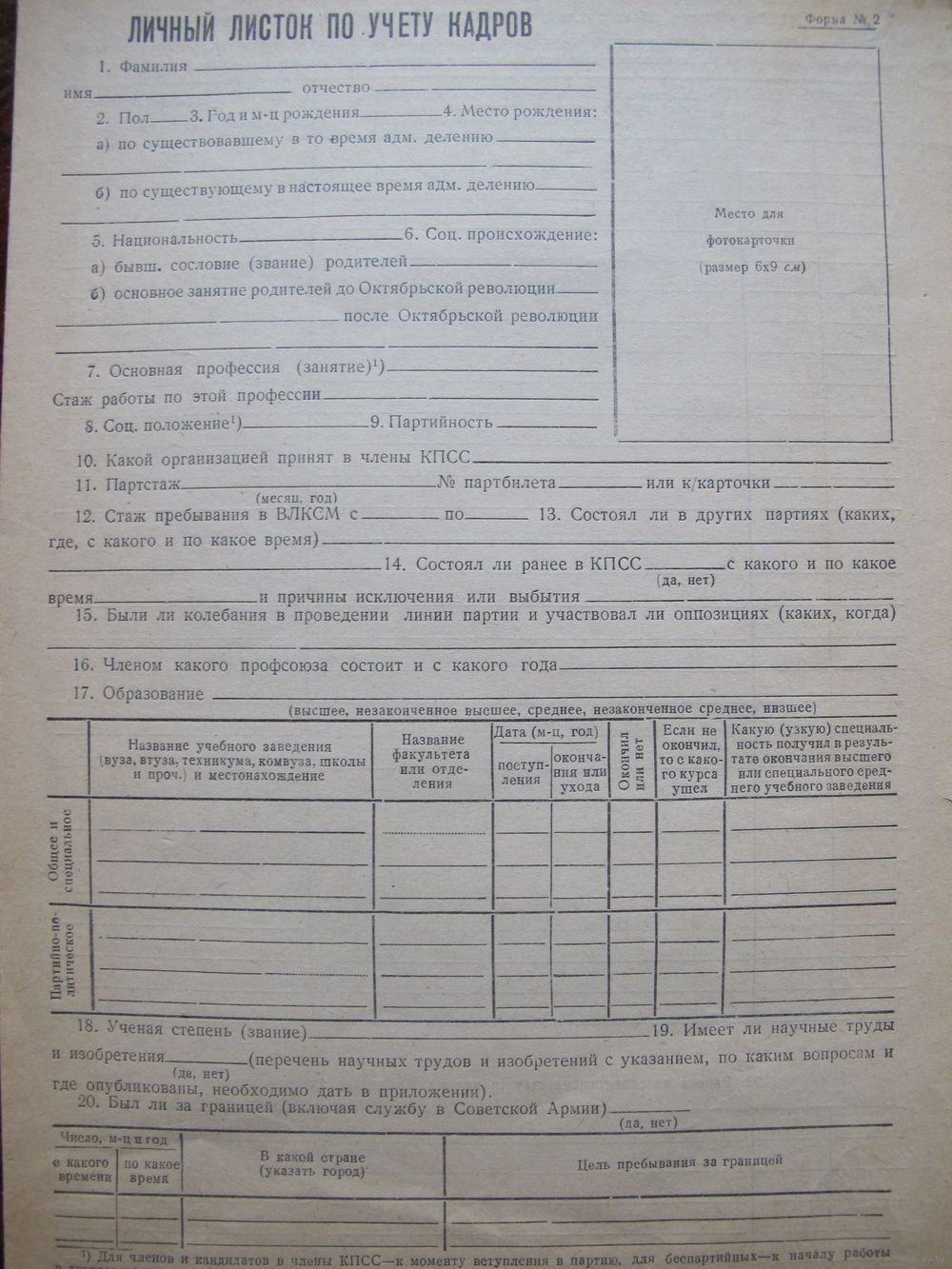 Личный листок по учету кадров времен СССР (чистый)