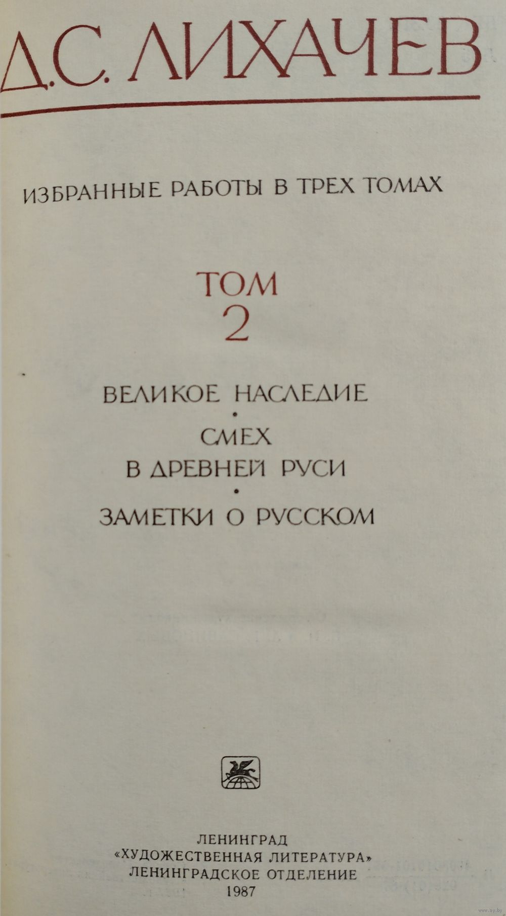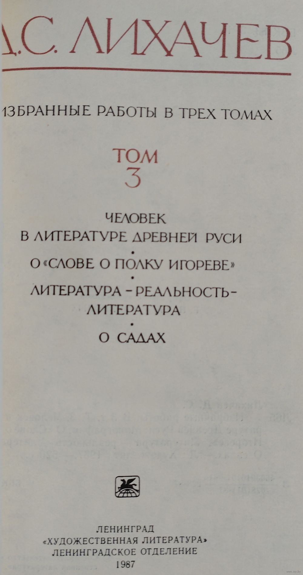 Цена за 3 тома. В первый том избранных работ известного советского ученого Д. С. Лихачева вошли эссе "О себе" и монографии "Развитие русской литературы X-XVII веков. Эпохи и стили" и "Поэтика древнерусской литературы". Во второй том избранных работ известного советского ученого Д. С. Лихачева вошла знаменитая монография "Смех в Древней Руси" и дпугие работы. В третий том избранных сочинений известного советского ученого, академика Д. С. Лихачева вошли следующие работы: "Человек в литературе Древней Руси", "О "Слове о полку Игореве", "Литература - реальность -литература" и "О садах".