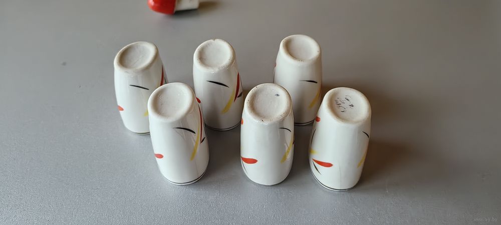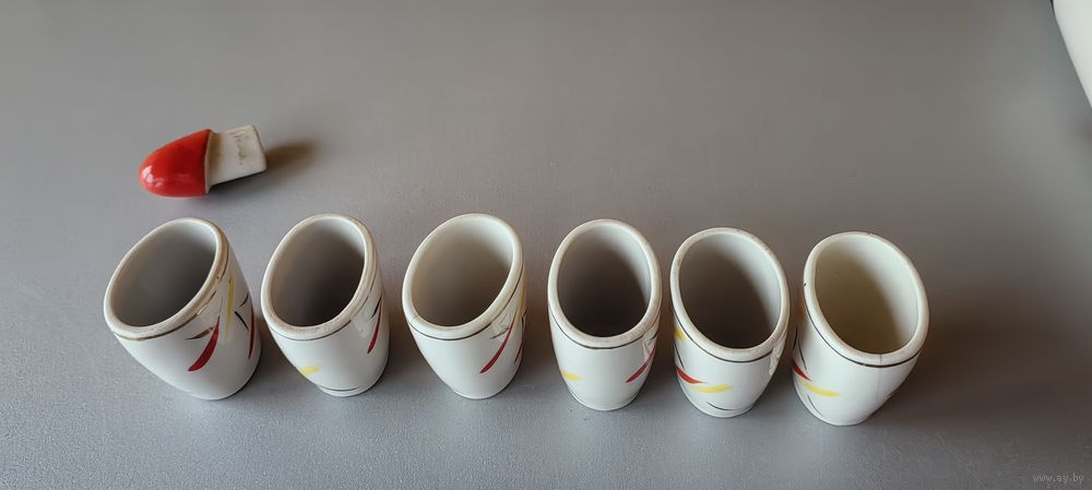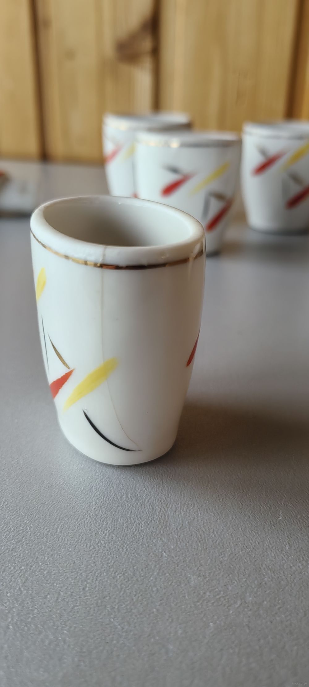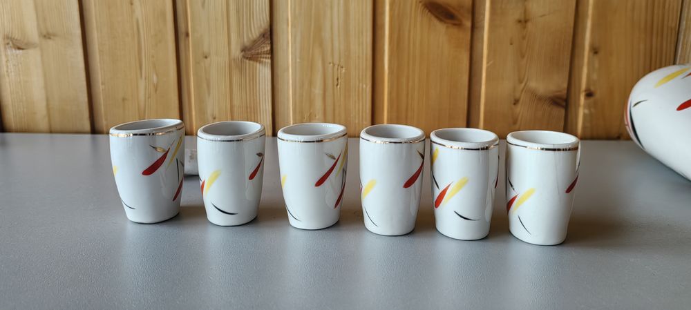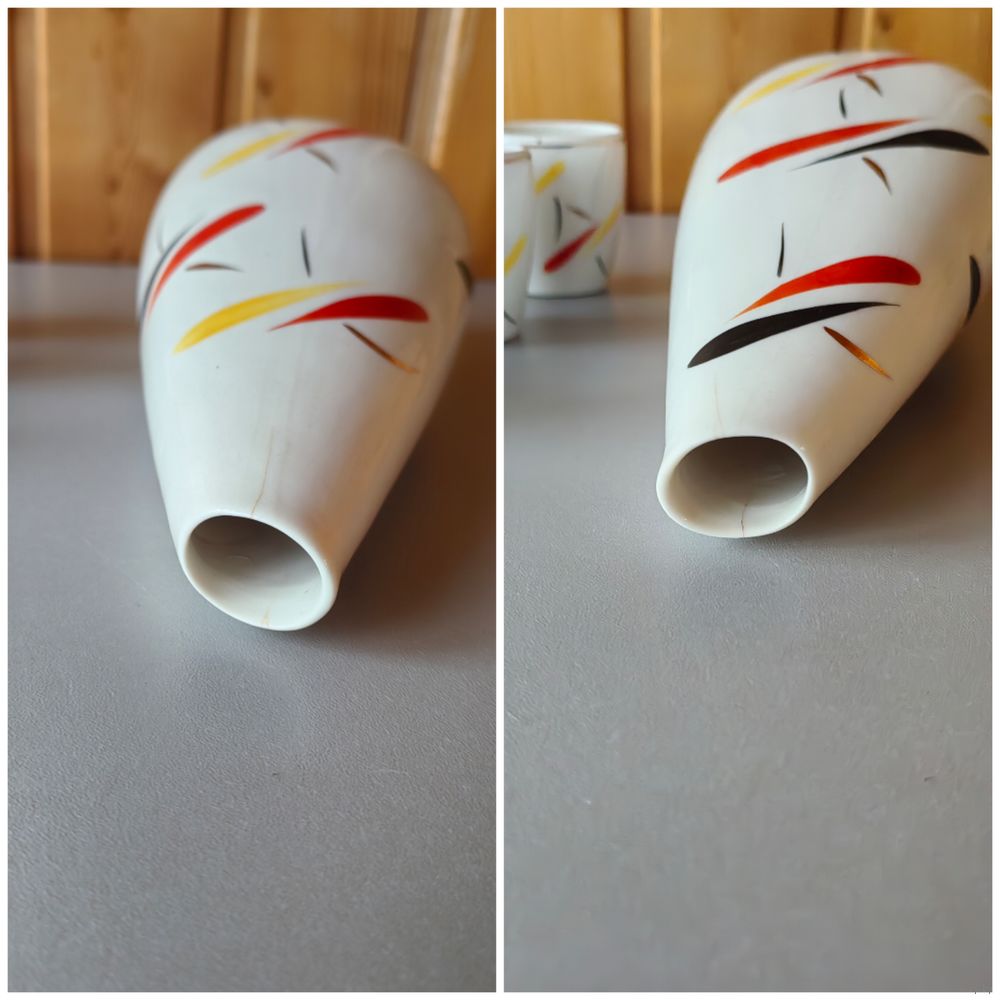 Сколов нет, но есть несколько трещин: на горлышке штофа две трещины и на двух рюмках. Возможно, пропустил еще где-то, но, кажется больше нет дефектов.