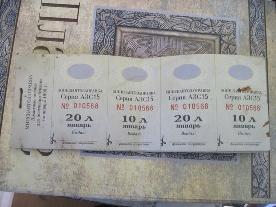Лимитные талоны на получение бензина. 10 листов по 60 литров. Январь-октябрь 1996 г.