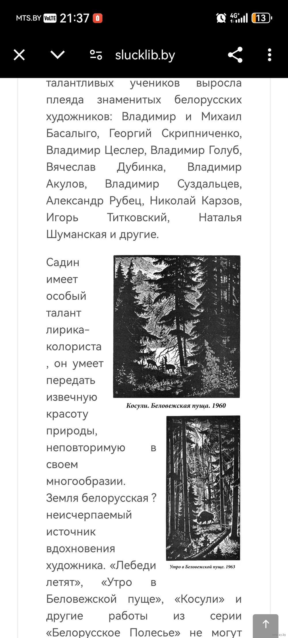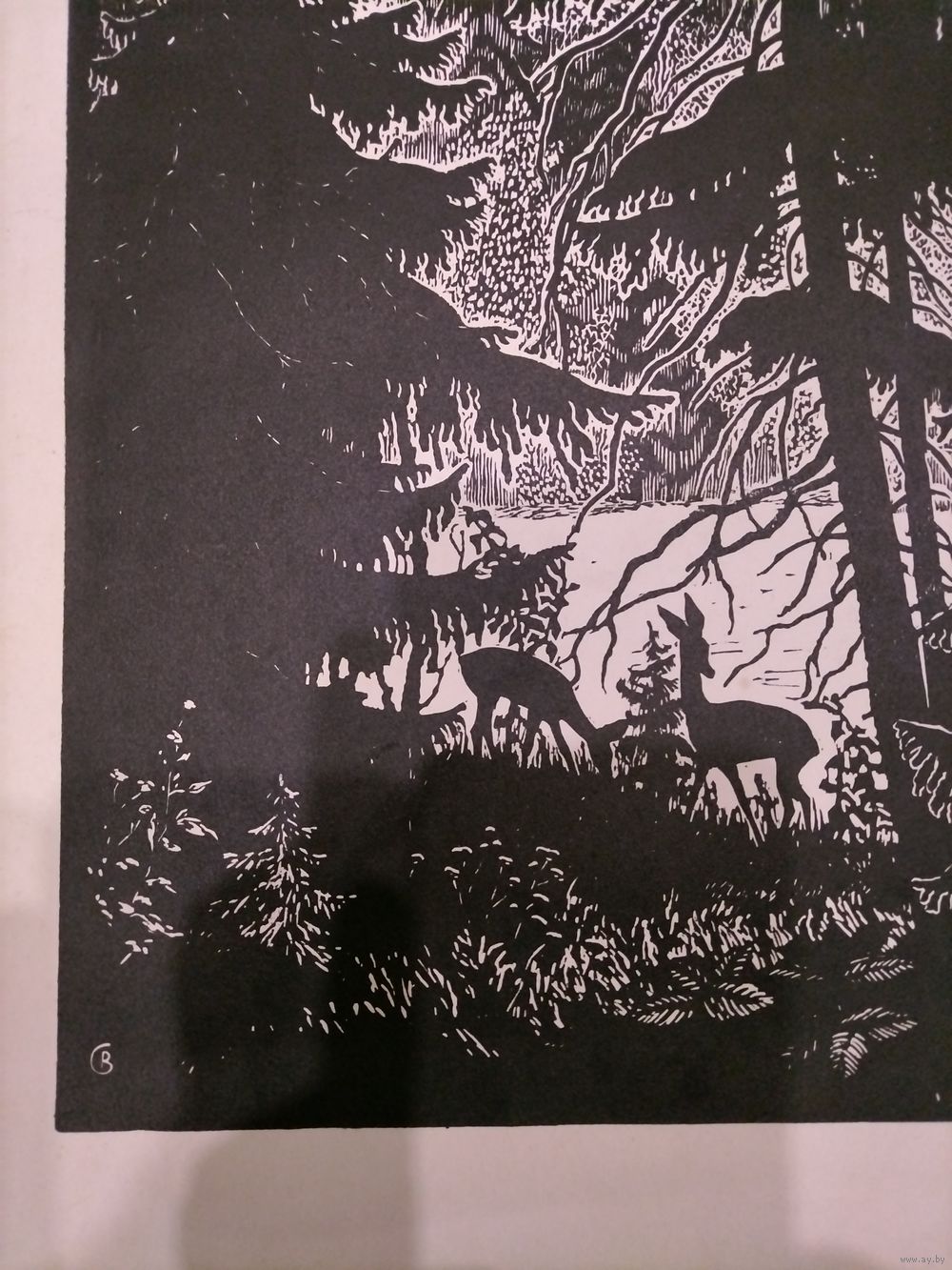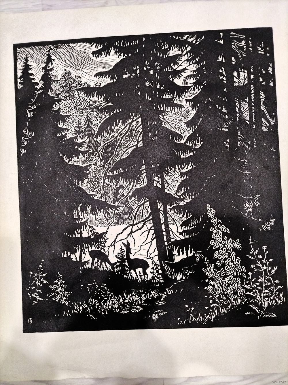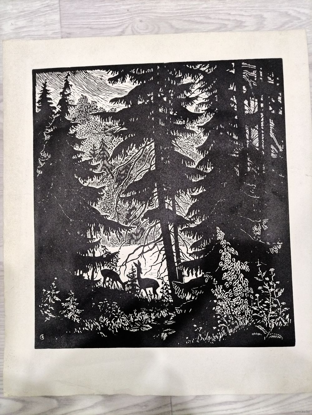 Эта работа — линогравюра «Беловежская пуща», созданная белорусским художником Владимиром Степановичем Садиным (1924–2010). (С обратной стороны выполнен рисунок какого-то деятеля политбюро).