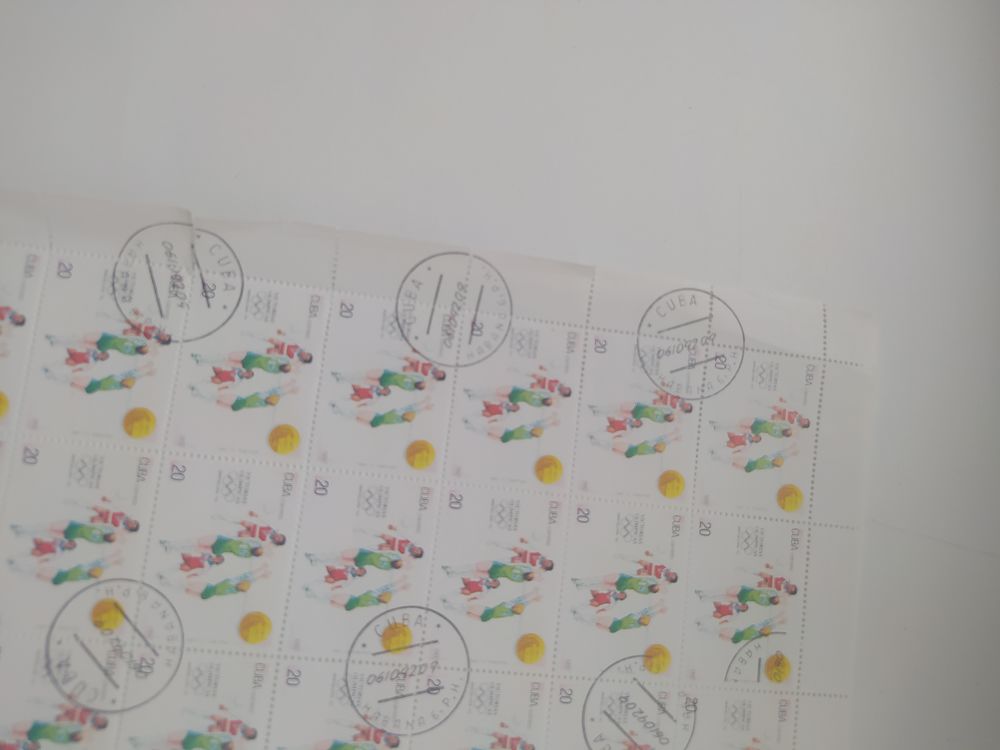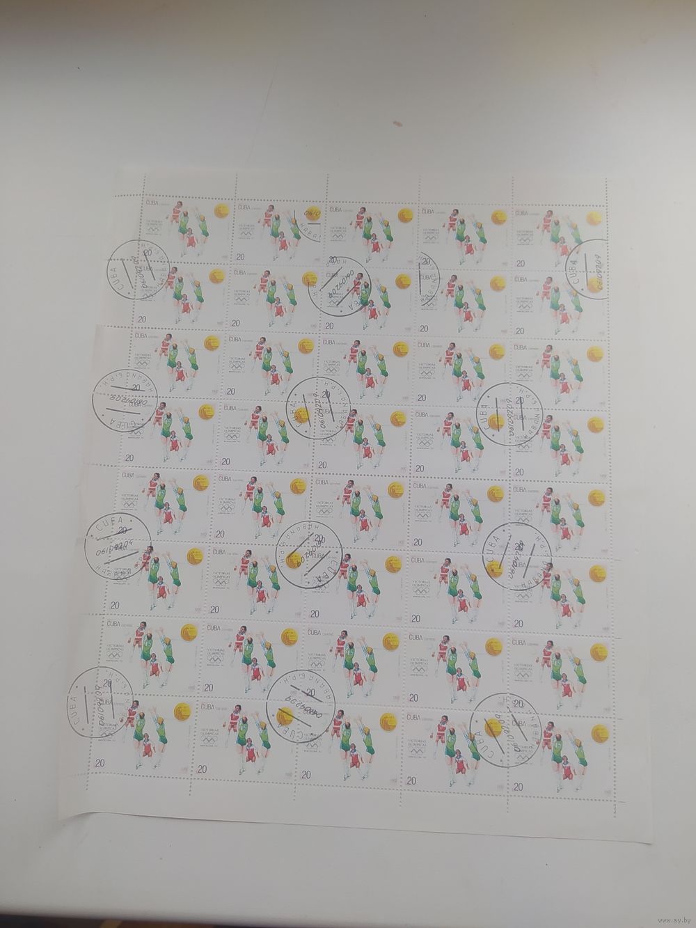 левый нижний угол есть незначительный перегиб ,разрыв по перфорации около 2 см слева над 3 рядом марок | |