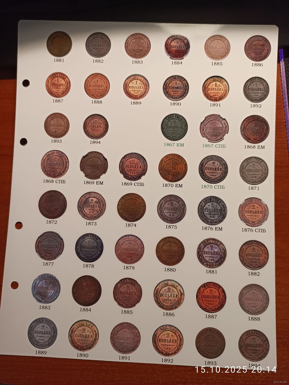 Формат Оптима. Под листы на 48 ячеек. Информационный лист с изображением медных монет 1 и 2 копейки последнего образца реформы 1867г. правления Александра ll и Александра lll. Самоделка. Распечатана на фотобумаге. Фото с ячейками для примера.