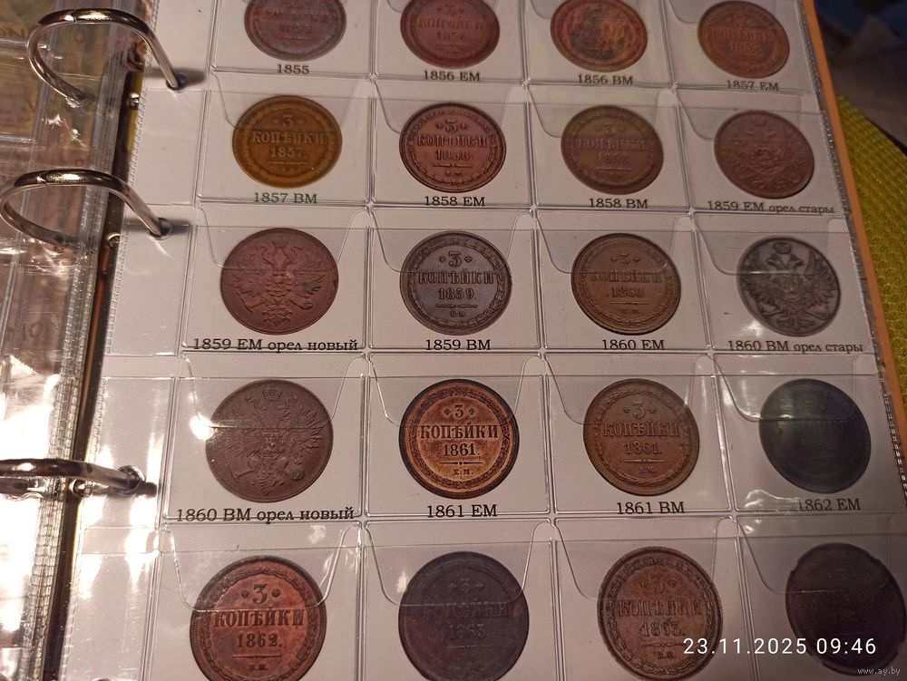 Формат Оптима. Под листы на 24 ячеек. Информационный лист с изображением медных монет 3 копейки Александра ll. Самоделка. Распечатана на фотобумаге. Фото с ячейками для примера.