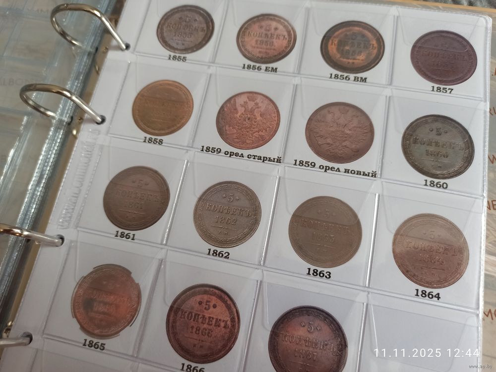 Формат Оптима. Под листы на 20 ячеек. Информационный лист с изображением медных монет 5 копеек Александра ll. Самоделка. Распечатана на фотобумаге. Фото с ячейками для примера.