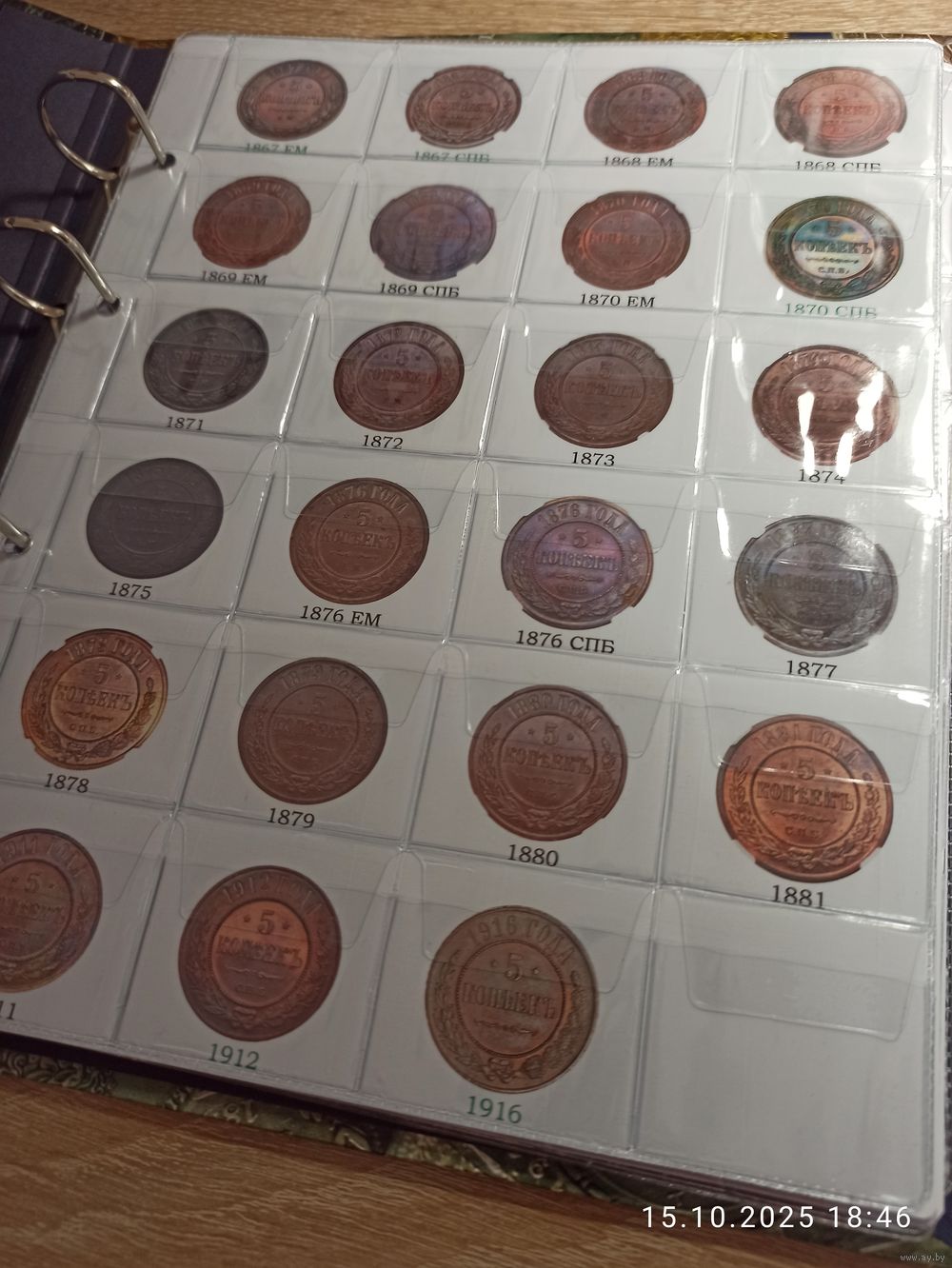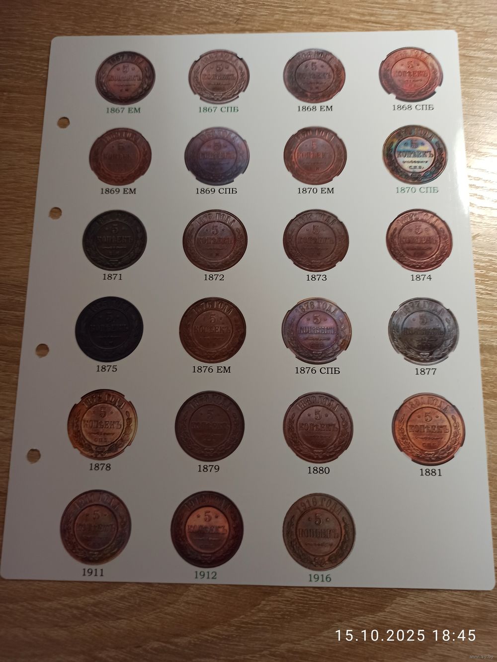 Формат Оптима. Под листы на 24 ячейки. Информационный лист с изображением медных монет 5 копеек последнего образца реформы 1867г. правления Александра ll, Александра lll и Николая ll. Самоделка. Распечатана на фотобумаге. Фото с ячейками для примера.