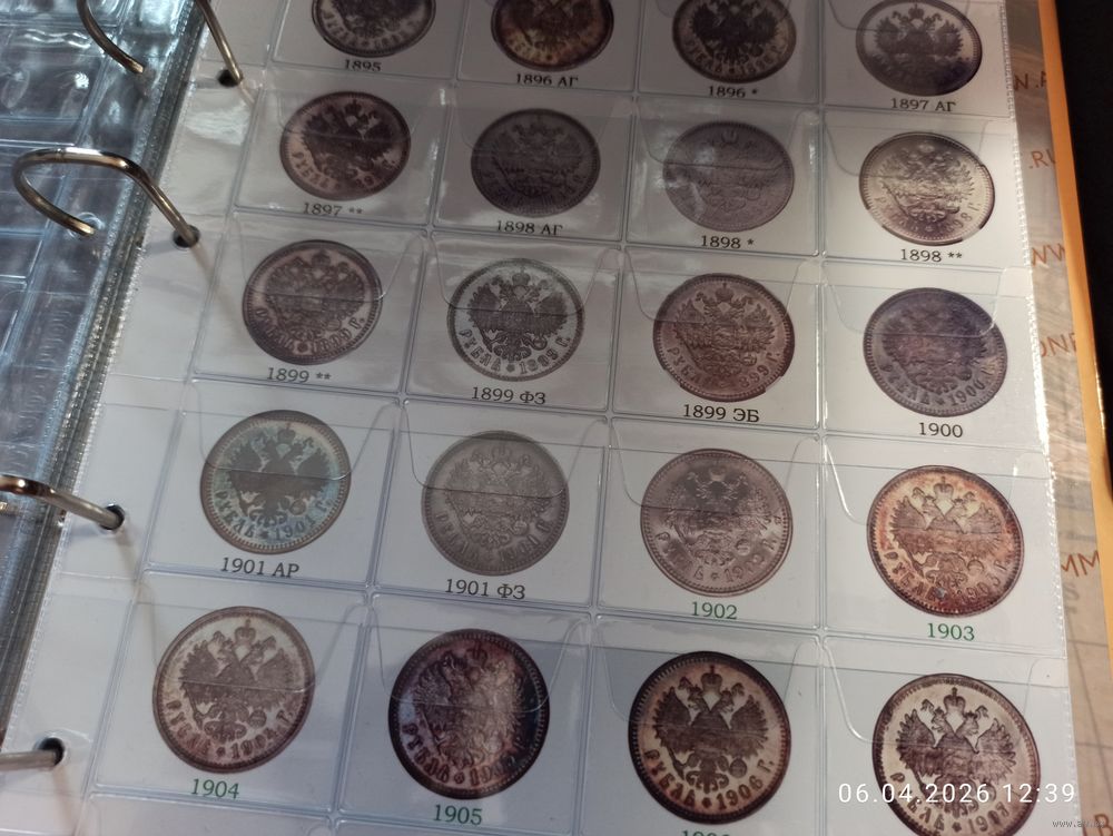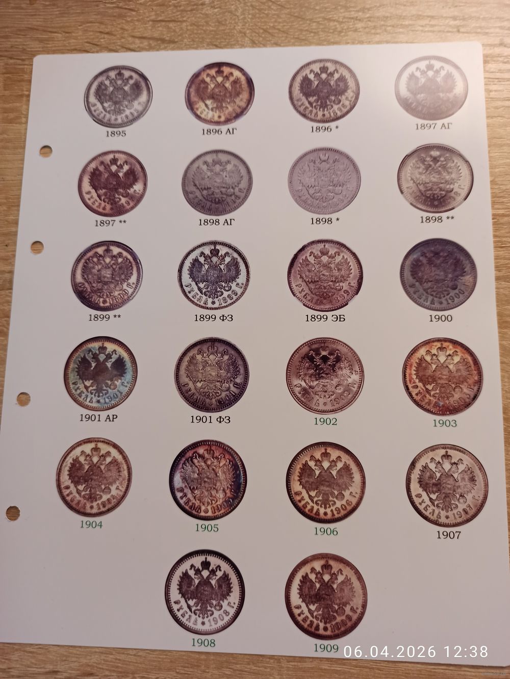 Формат Оптима. Под листы на 24 ячейки. Информационный лист с изображением серебряных монет 1 рубль правления Николая II. Самоделка. Распечатан на фотобумаге. Фото листа с ячейками для примера.