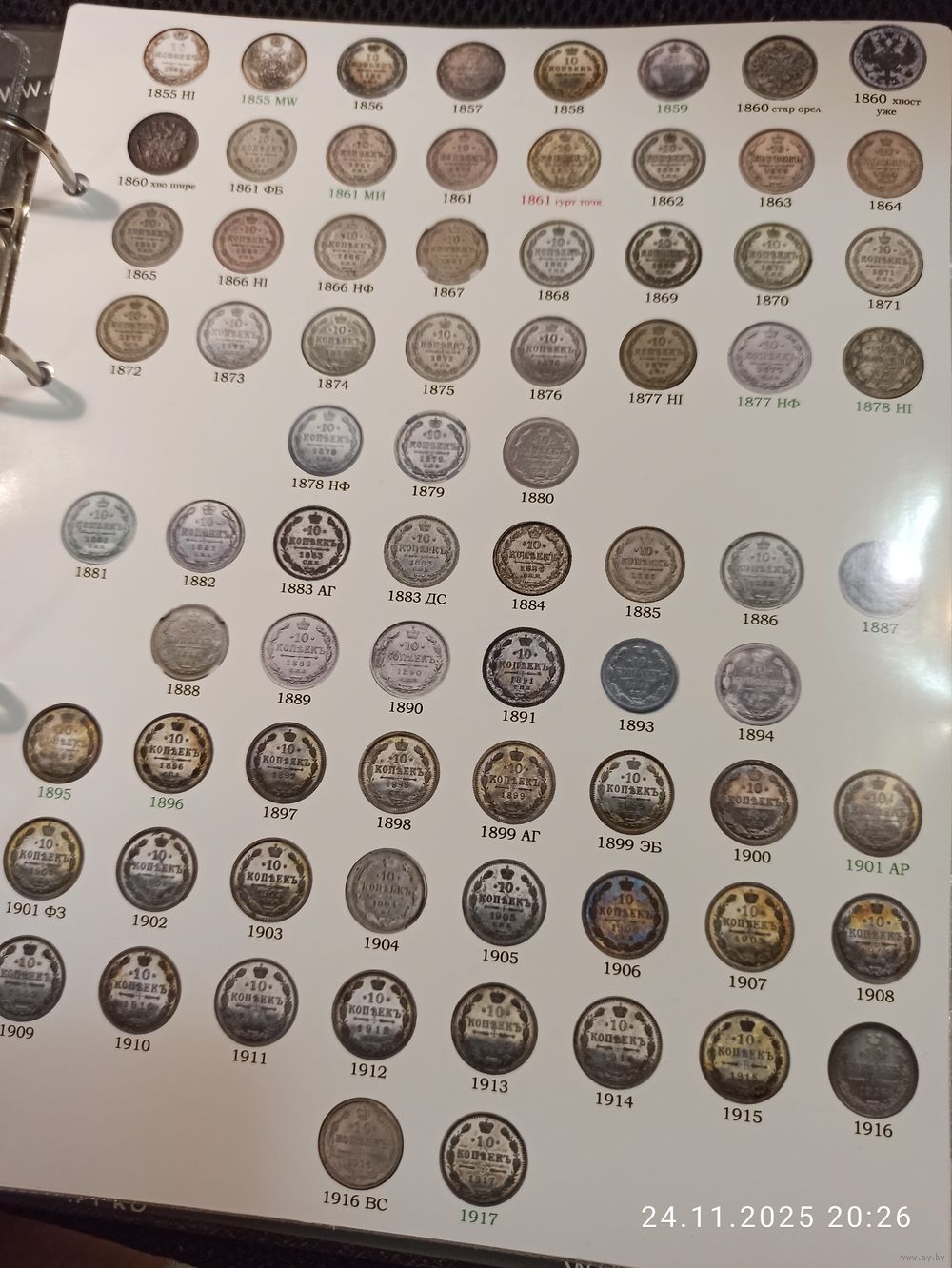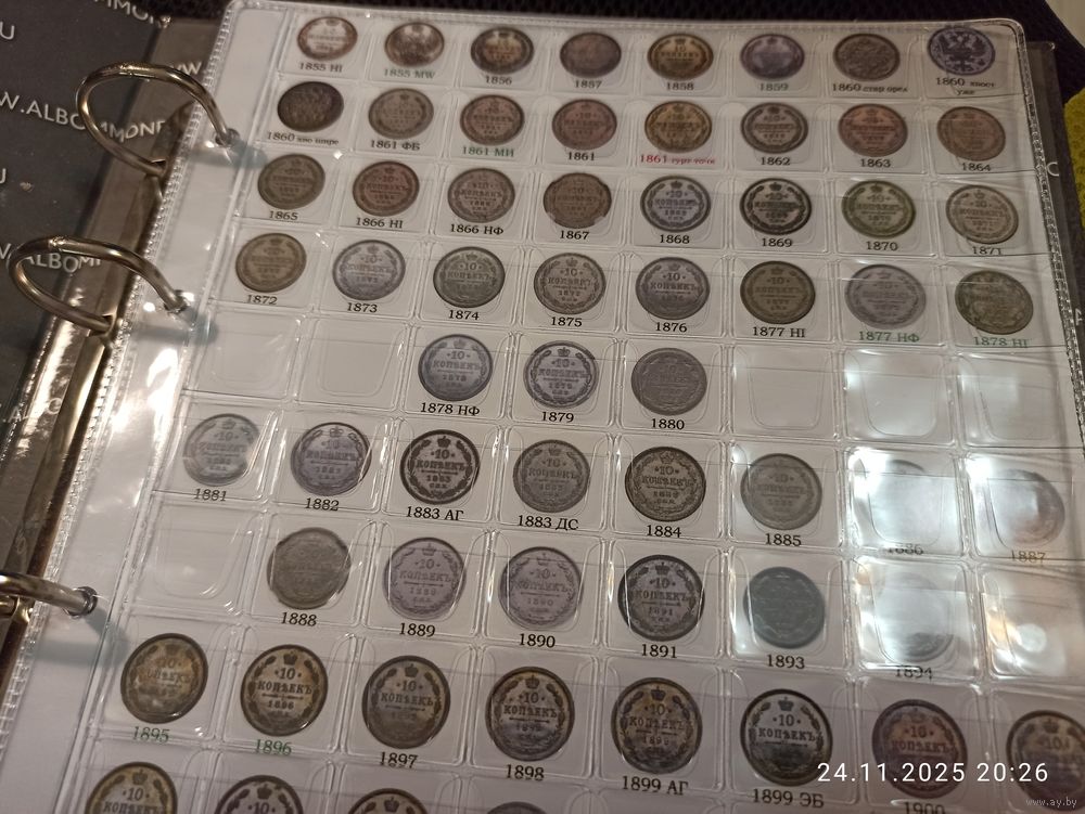 Формат Оптима. Под листы на 70 ячеек. Информационный лист с изображением серебряных монет 10 копеек правления Александра II, Александра III и Николая II. Самоделка. Распечатан на фотобумаге. Фото листа с ячейками для примера.