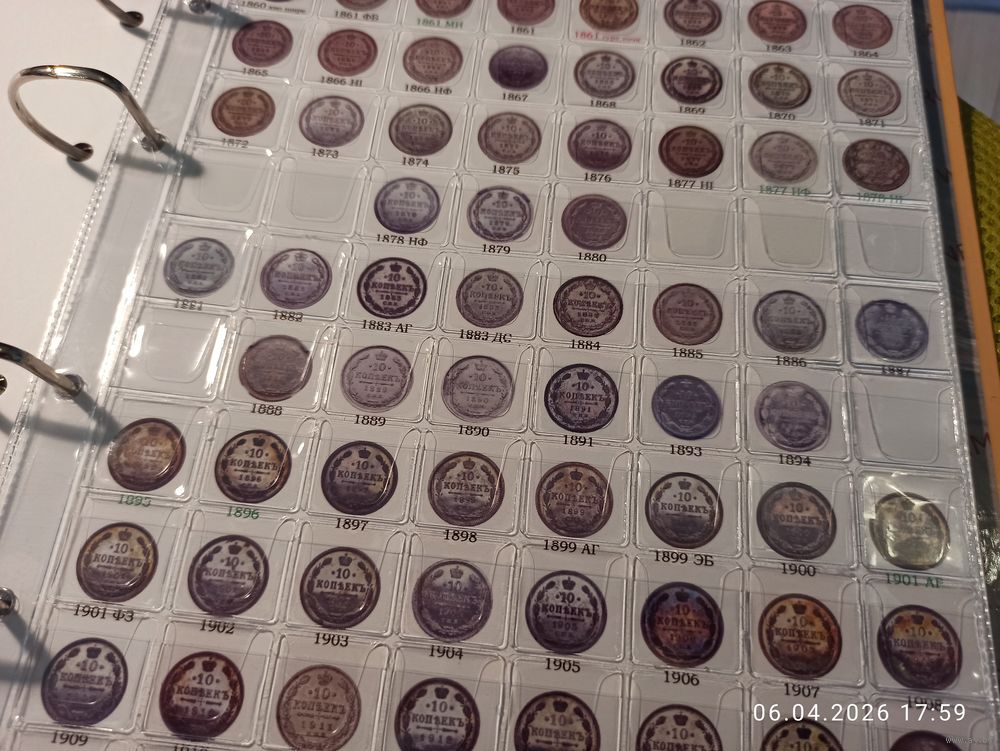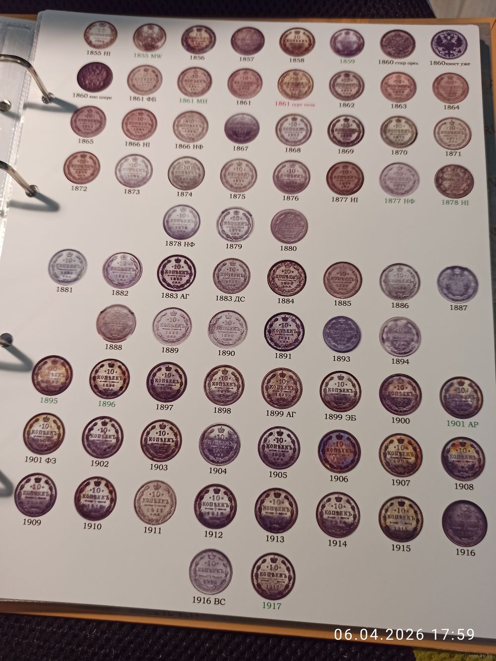 Формат Оптима. Под листы на 70 ячеек. Информационный лист с изображением серебряных монет 10 копеек правления Александра II, Александра III и Николая II. Самоделка. Распечатан на фотобумаге. Фото листа с ячейками для примера.