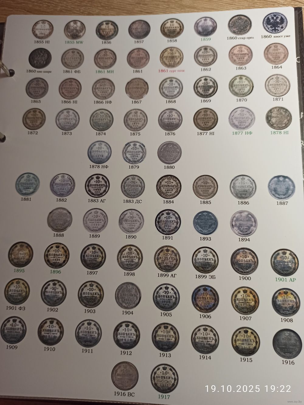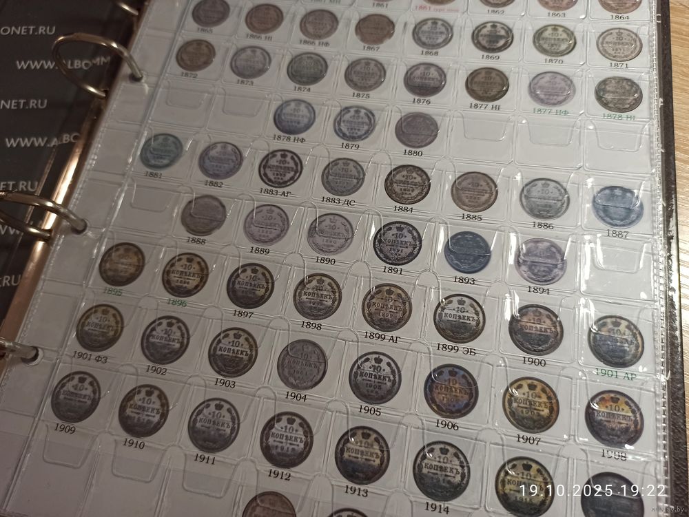Формат Оптима. Под листы на 70 ячеек. Информационный лист с изображением серебряных монет 10 копеек правления Александра II, Александра III и Николая II. Самоделка. Распечатан на фотобумаге. Фото листа с ячейками для примера.