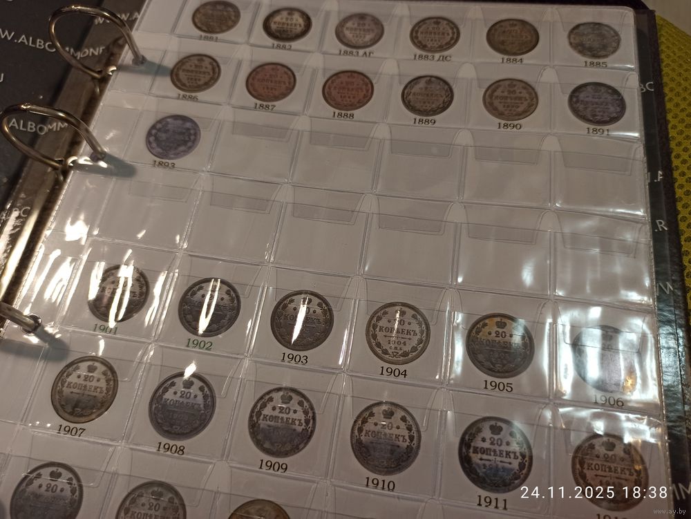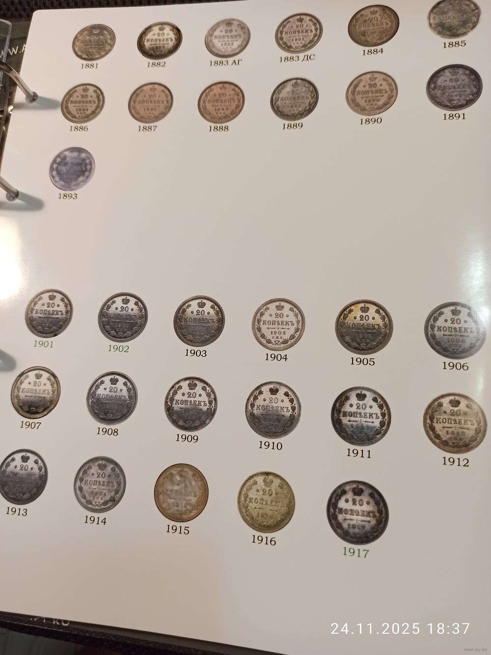 Формат Оптима. Под листы на 48 ячеек. Информационный лист с изображением серебряных монет 20 копеек правления Александра III и Николая II. Самоделка. Распечатана на фотобумаге. Фото листа с ячейками для примера.