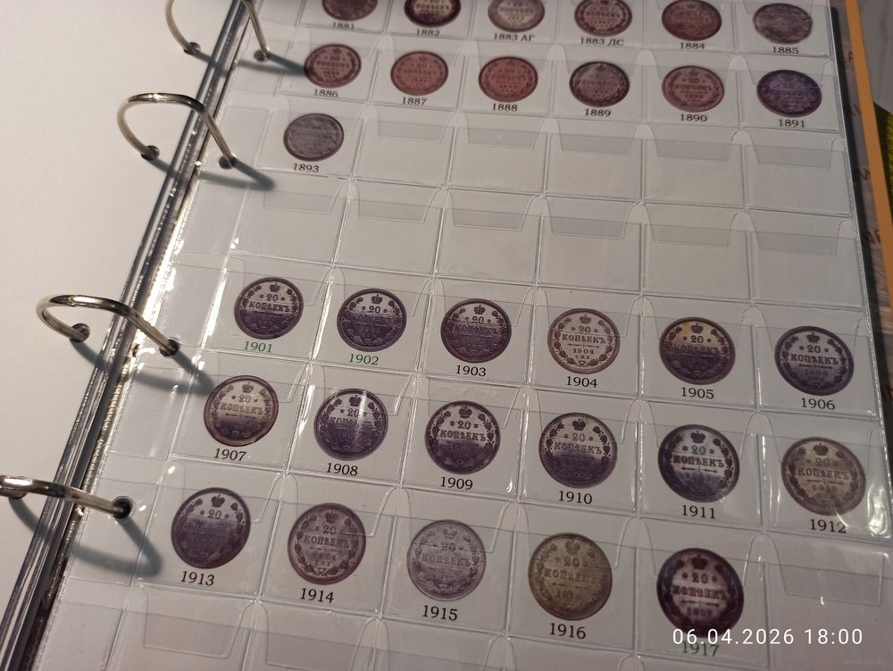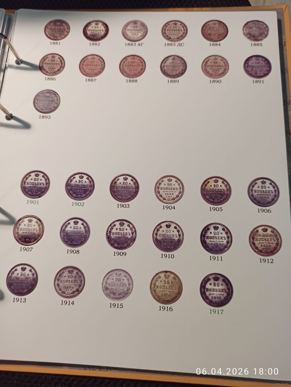 Формат Оптима. Под листы на 48 ячеек. Информационный лист с изображением серебряных монет 20 копеек правления Александра III и Николая II. Самоделка. Распечатана на фотобумаге. Фото листа с ячейками для примера.