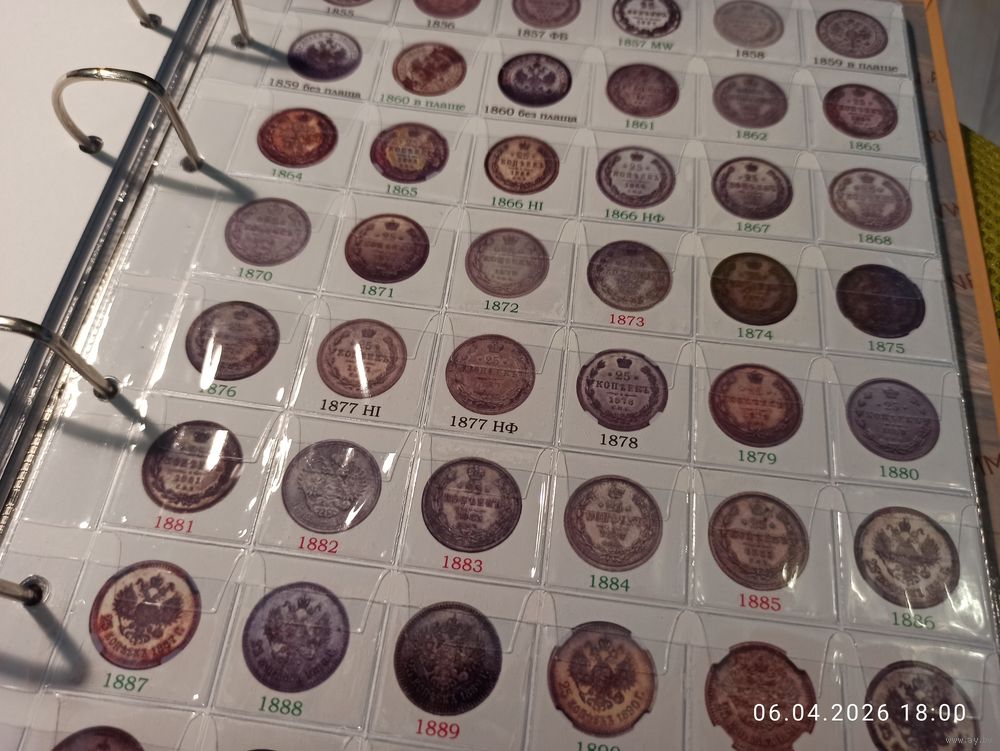 Формат Оптима. Под листы на 48 ячеек. Информационный лист с изображением серебряных монет 25 копеек правления Александра II, Александра III и Николая II. Самоделка. Распечатана на фотобумаге. Фото листа с ячейками для примера