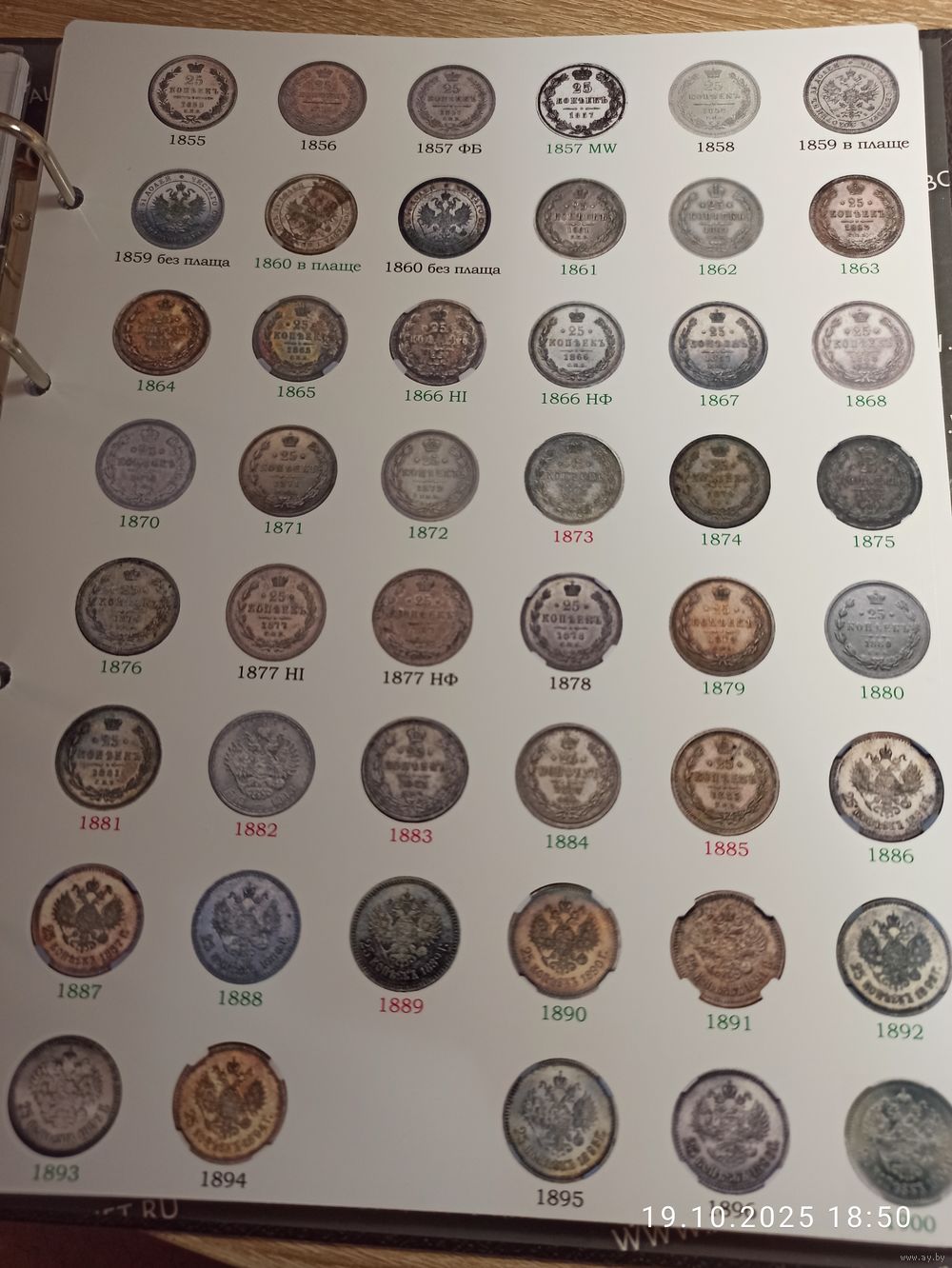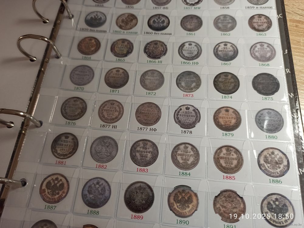 Формат Оптима. Под листы на 48 ячеек. Информационный лист с изображением серебряных монет 25 копеек правления Александра II, Александра III и Николая II. Самоделка. Распечатана на фотобумаге. Фото листа с ячейками для примера