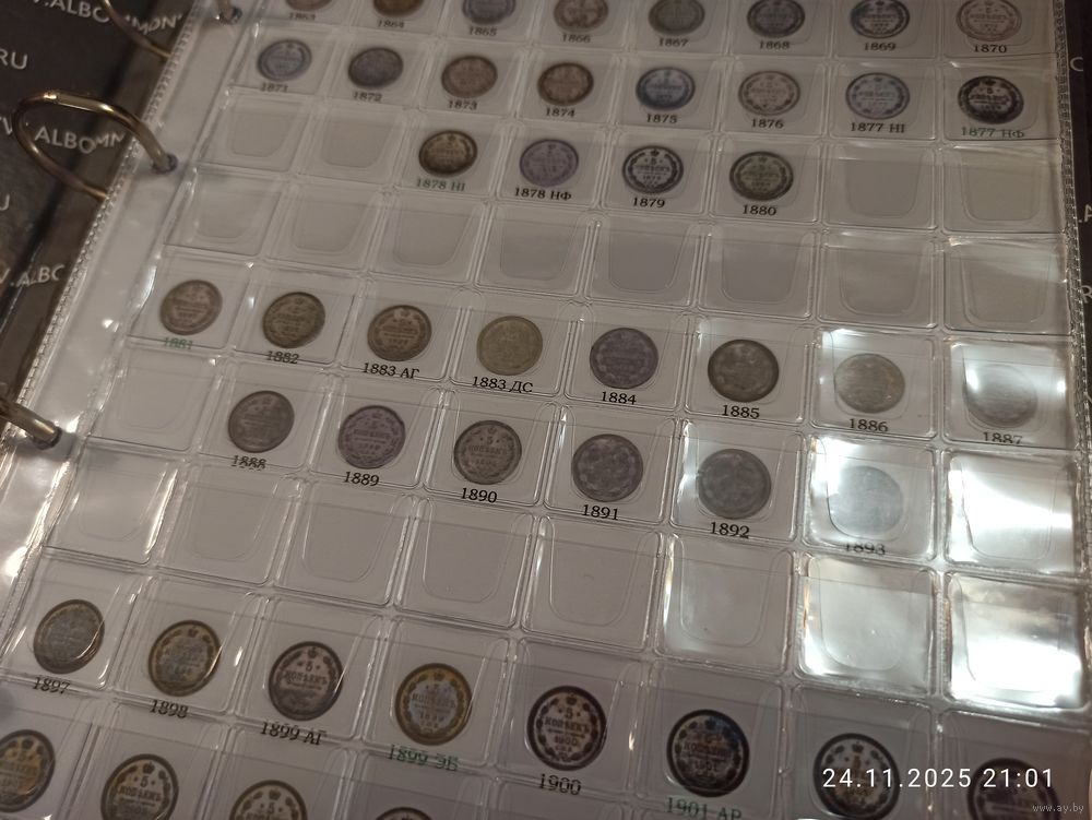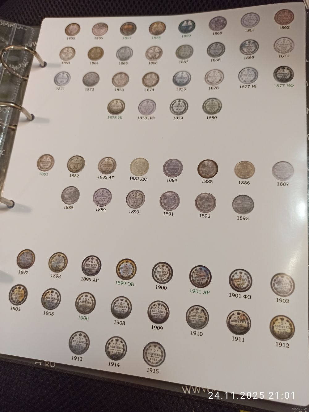 Формат Оптима. Под листы на 88 ячеек. Информационный лист с изображением серебряных монет 5 копеек правления Александра II, Александра III и Николая II. Самоделка. Распечатан на фотобумаге. Фото листа с ячейками для примера
