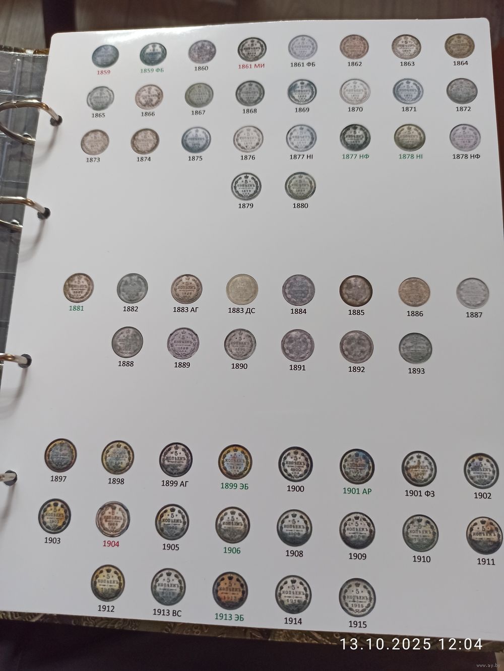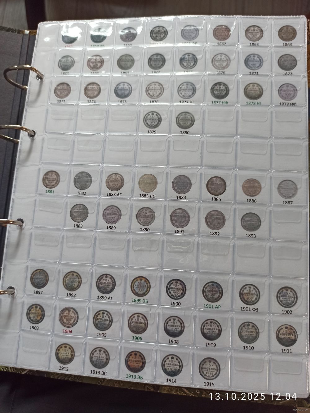 Формат Оптима. Под листы на 88 ячеек. Информационный лист с изображением серебряных монет 5 копеек правления Александра II, Александра III и Николая II. Самоделка. Распечатан на фотобумаге. Фото листа с ячейками для примера.