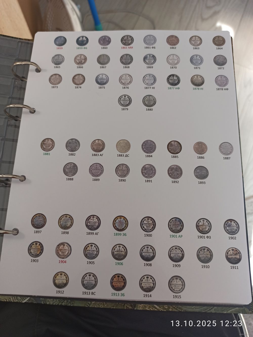 Формат Оптима. Под листы на 88 ячеек. Информационный лист с изображением серебряных монет 5 копеек правления Александра II, Александра III и Николая II. Самоделка. Распечатан на фотобумаге. Фото листа с ячейками для примера.