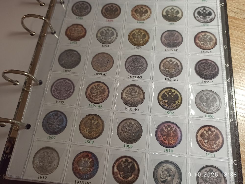 Формат Оптима. Под листы на 35 ячеек. Информационный лист с изображением серебряных монет 50 копеек правления Александра III и Николая II. Самоделка. Распечатан на фотобумаге. Фото листа с ячейками для примера