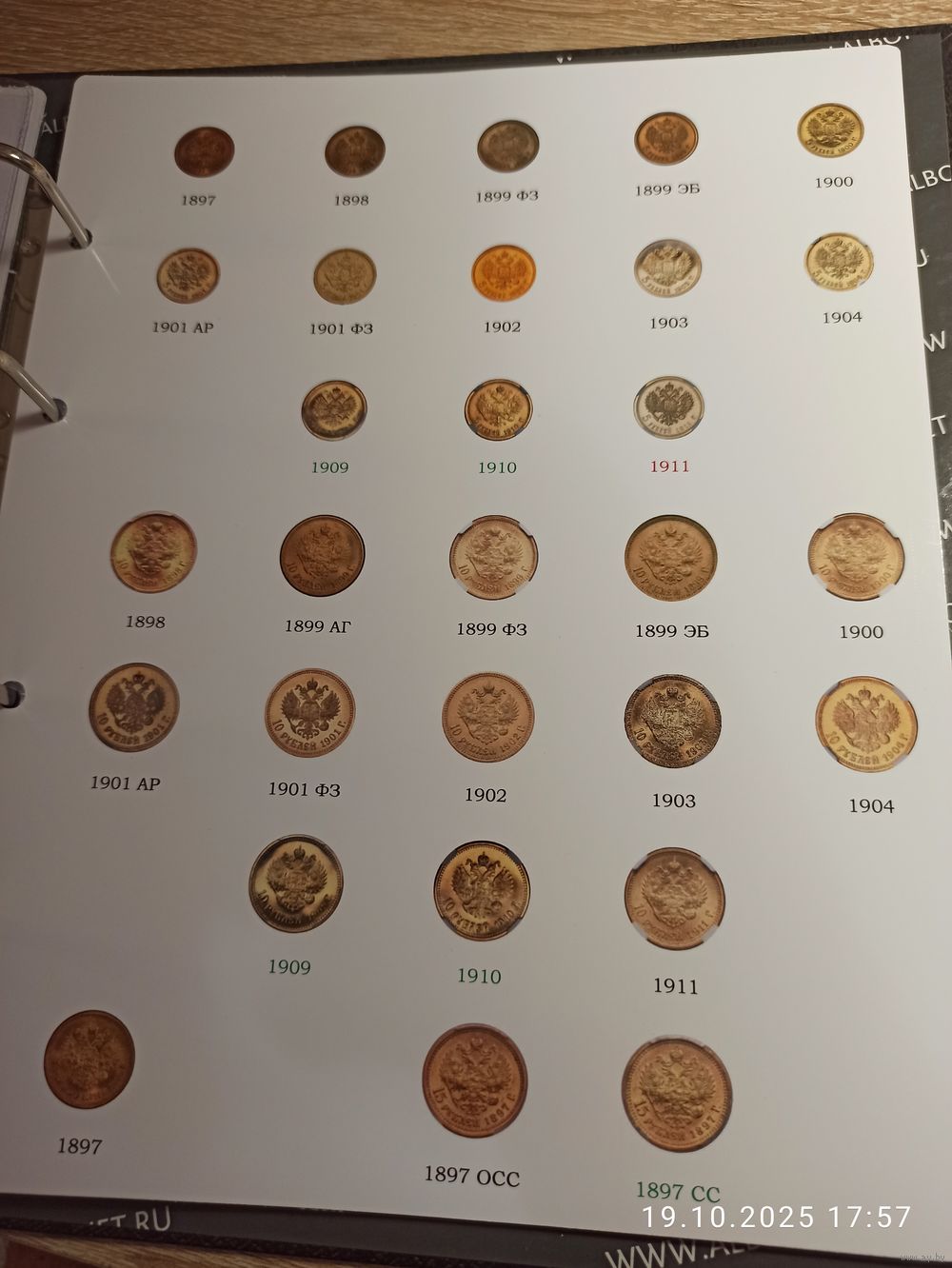 Формат Оптима. Под скользящие листы на 35 ячеек. Информационный лист с изображением золотых монет 5; 7.5; 10 и 15 рублей правления Николая II. Самоделка. Распечатана на фотобумаге. Фото с ячейками для примера.