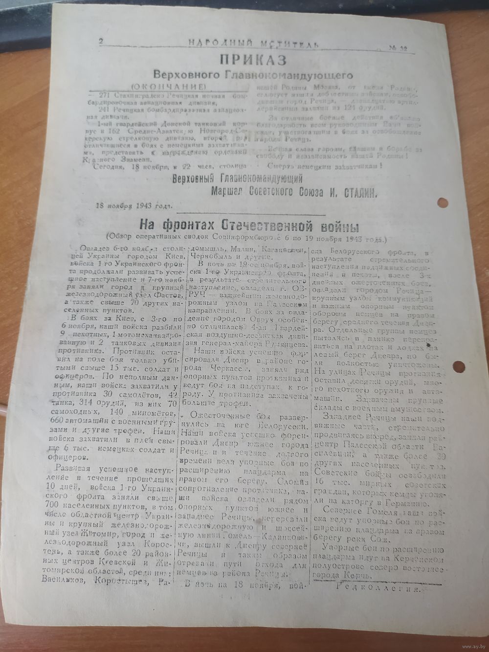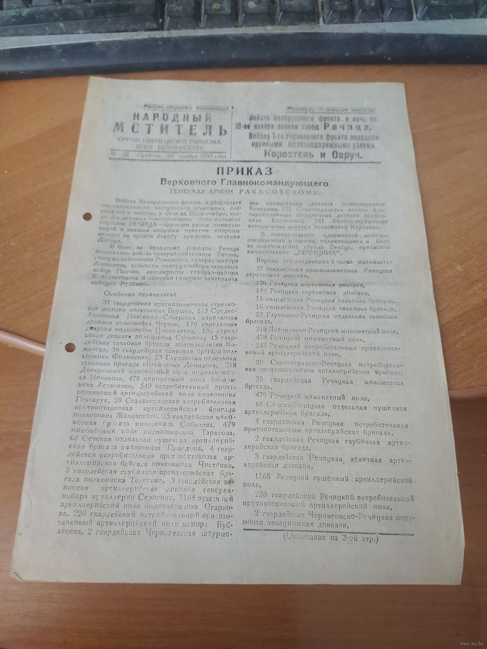Газета-листовка Ивенецкого райкома КП (б) Беларуси № 32 от 20 ноября 1943 г. Вероятней всего печаталась на территории Налибокской пущи в партизанской бригаде им. Щорса.