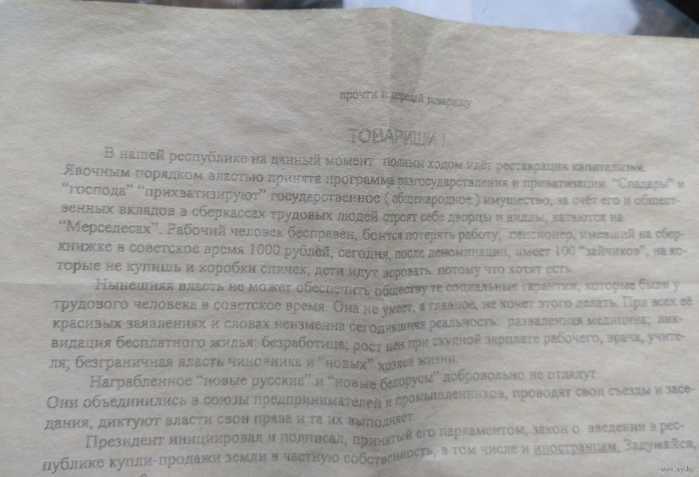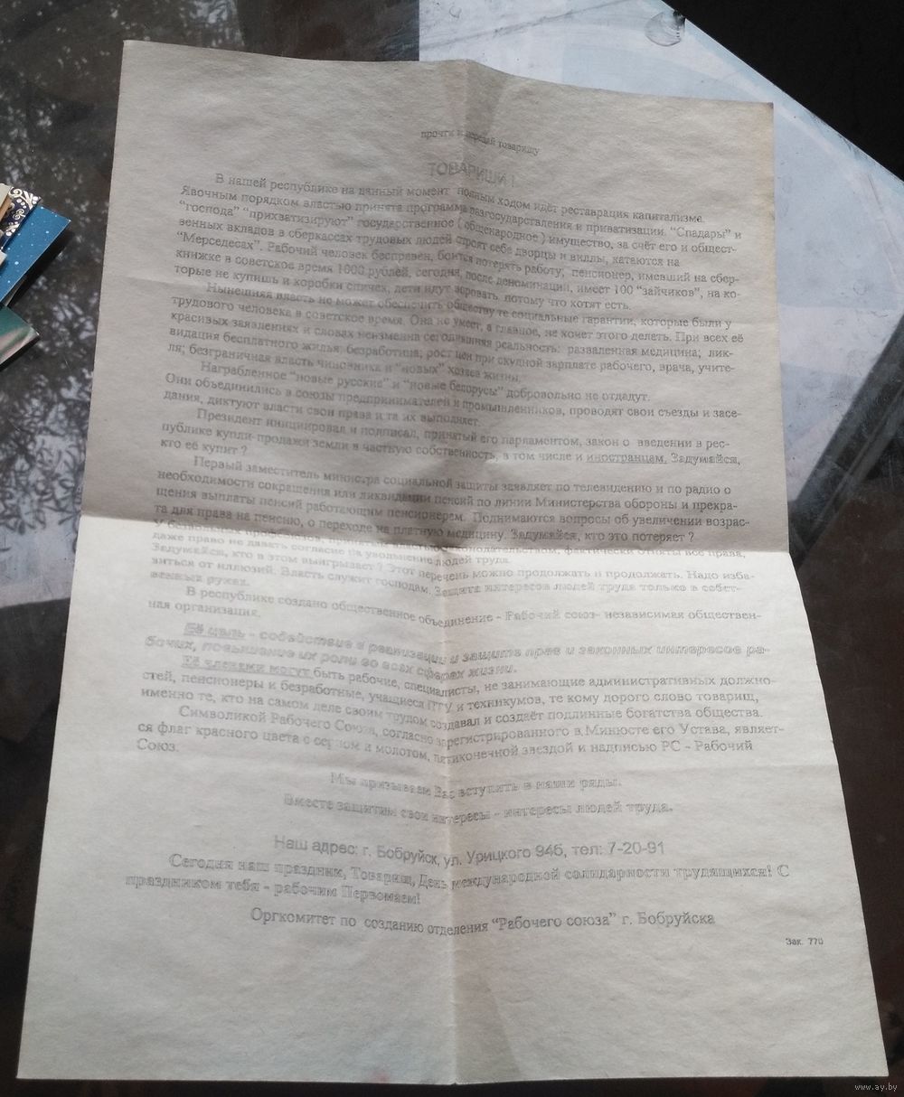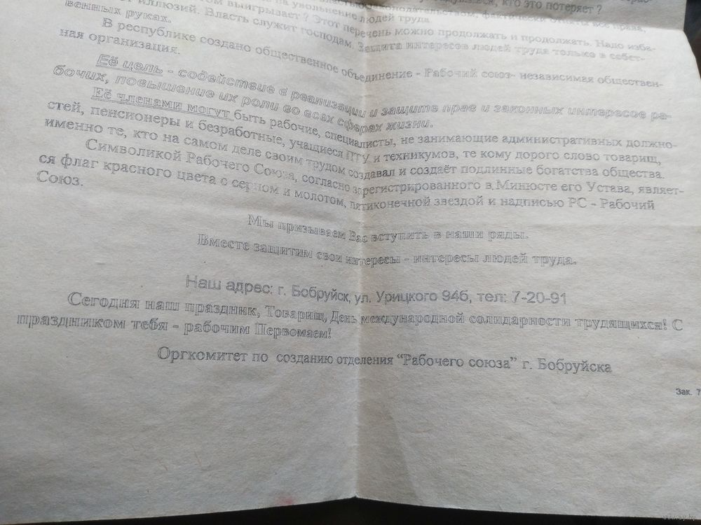 Листовка Оргкомитет по созданию отделения Рабочего союза в Бобруйске