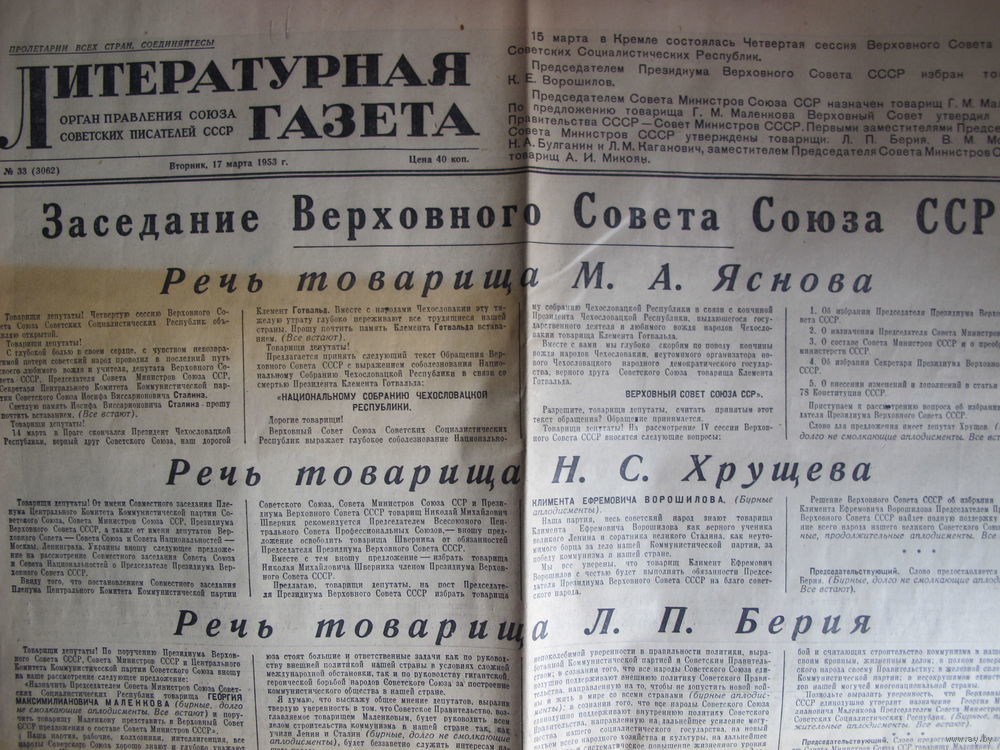Отчет о первом после смерти Сталина заседании Верховного Совета СССР. Сообщение о смерти К. Готвальда