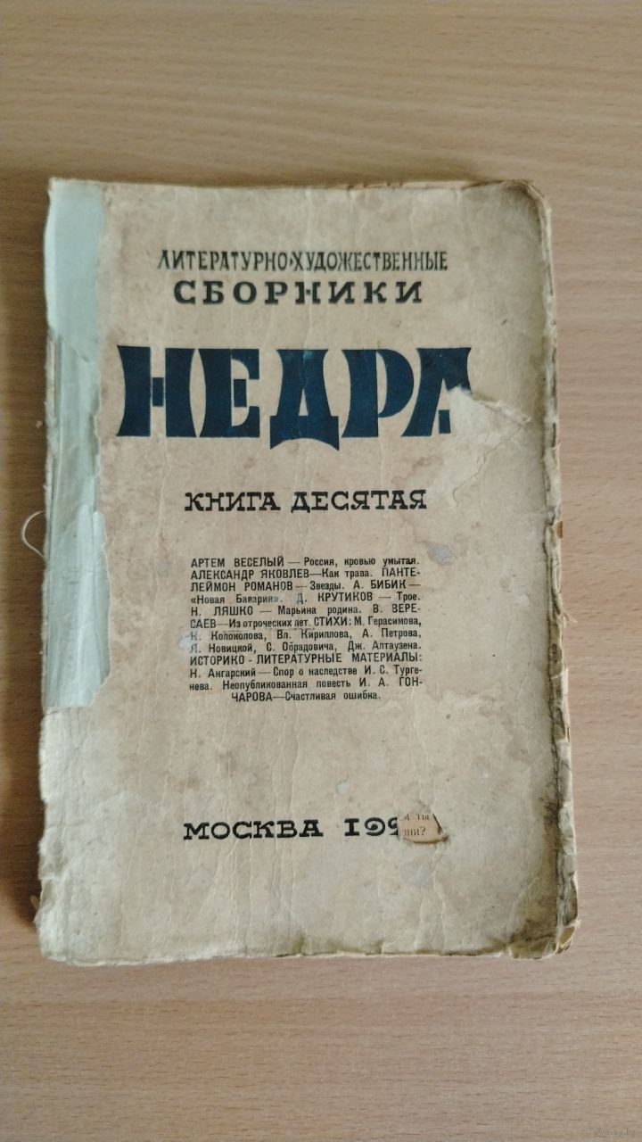 Литературно-художественные сборники "Недра" выходили в Москве в 1923-1924 в издательстве "Новая Москва", в 1925-1931 - в издательстве "Недра". Всего вышло 20 сборников (периодичность - от 1 до 3 в год). Редактор Н.С.Ангарский (Клестов). Многие сборники издательства «Недра» подвергались аресту советской цензурой..........................Содержание.....Артем Веселый...Россия кровью умытая, роман...5.....Мих.Герасимов...Осень, стихи...62...О чем так тревожно и властно, стихи...63.....Николай Колоколов...Половодье, стихи...64.....Александр Яковлев...Как трава...65.....Пантелеймон Романов...Звезды...81.....Владимир Кириллов...Не разрывай единый круг, стихи...100...Все прошло: тревоги и заботы, стихи...101.....Алексей Петров...Осень в зоосаду, стихи...103.....Людмила Новицкая...Осыпается молодость красными кленами, стихи...104.....А.Бибик...Новая Бавария, рассказ...105.....С.Обрадович...Волна, стихи...160.....Джек Алтаузен...Эмигранты, стихи...162.....Д.Крутиков...Трое...165.....Н.Ляшко...Марьина родина...177.....В.Вересаев...Из отроческих лет, воспоминания...189-194. Дальше страниц нет.