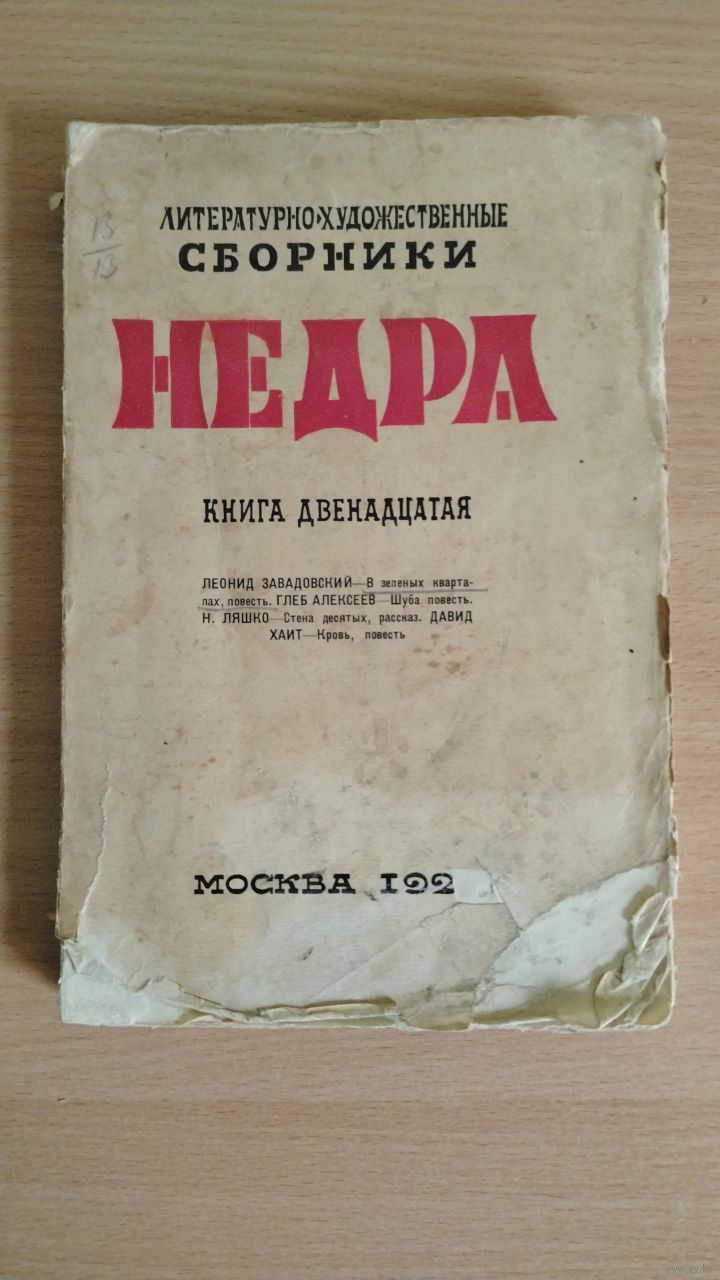 Литературно-художественные сборники "Недра" выходили в Москве в 1923-1924 в издательстве "Новая Москва", в 1925-1931 - в издательстве "Недра". Всего вышло 20 сборников (периодичность - от 1 до 3 в год). Редактор Н.С.Ангарский (Клестов). Многие сборники издательства «Недра» подвергались аресту советской цензурой. Глеб Алексеев...Арестован 26 апреля 1938 года, осуждён Военной коллегией Верховного Суда СССР по обвинению в участии в антисоветской террористической организации, расстрелян 1 сентября. Реабилитирован в 1956 году....Петр Орешин...28 октября 1937 года Пётр Орешин был арестован, 15 марта 1938 года приговорён к расстрелу и в тот же день расстрелян. Реабилитирован в 1956 году Военной коллегией Верховного суда СССР[2]....Давид Хаит — советский еврейский писатель, беллетрист. В творчестве присутствовала еврейская тема (писал на русском языке). Дата смерти неизвестна...Леонид Завадовский... Арестован 2 февраля 1938 г. Постановлением тройки НКВД от 9 февраля 1938 г. обвинен в контрреволюционной агитации и террористических намерениях и приговорен к расстрелу. Расстрелян 21 февраля 1938 г. 22 марта 1958 г. президиум Липецкого областного суда полностью реабилитировал Л. Завадовского из-за отсутствия состава преступления[2]. Содержание...Леонид Завадовский..В зеленых кварталах, повесть...3...Глеб Алексеев...Шуба, повесть...89...Н.Ляшко...Стена десятых, рассказ...155,,,Давид Хаит...Кровь, повесть...175.