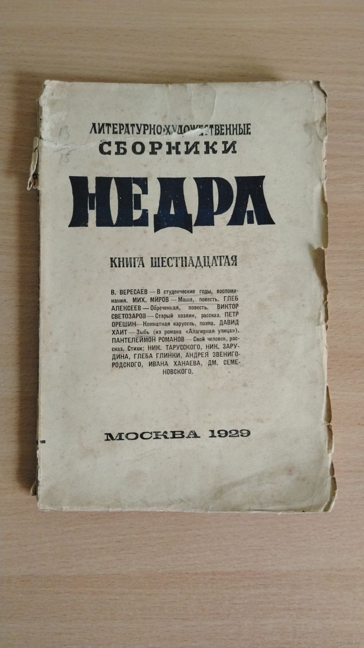 В данном сборнике были впервые опубликованы воспоминания В.Вересаева "В студенческие годы".... Многие сборники издательства «Недра» подвергались аресту советской цензурой. Михаил Миров - русский советский писатель. Обстоятельства жизни не установлены (по одной из версий под этим псевдонимом мог писать М.Шолохов)....Глеб Алексеев...Арестован 26 апреля 1938 года, осуждён Военной коллегией Верховного Суда СССР по обвинению в участии в антисоветской террористической организации, расстрелян 1 сентября. Реабилитирован в 1956 году....Петр Орешин...28 октября 1937 года Пётр Орешин был арестован, 15 марта 1938 года приговорён к расстрелу и в тот же день расстрелян. Реабилитирован в 1956 году Военной коллегией Верховного суда СССР[2]....Давид Хаит — советский еврейский писатель, беллетрист. В творчестве присутствовала еврейская тема (писал на русском языке). Дата смерти неизвестна...Николай Зарудин...Арестован 21 июня 1937 года. 13 августа 1937 года по обвинению в участии в антисоветской террористической организации приговорён Военной коллегией Верховного суда СССР к высшей мере наказания. В этот же день расстрелян. Место захоронения — «Могила невостребованных прахов» на Донском кладбище в Москве. Реабилитирован 7 июля 1956 года[4].............Содержание....В.Вересаев...В студенческие годы, воспоминания...5....Мих.Миров...Маша,повесть...44.....Ник.Тарусский...Подуло с чердака, стихи...115...От солнца, бьющего в муслин, стихи...116...Первый мороз, стихи...117...После ливня, стихи...118.....Ник.Зарудин...Моя дочь,стихи...119...Юность,стихи...120...Письмо, которое не отослано, стихи...121...Ночлег на Унже, стихи...123.....Глеб Глинка...Чучело, стихи...124.....Глеб Алексеев...Обреченная, девятнадцать писем женщины, повесть...126.....Андрей Звенигородский...Ударил ливень, стихи...149...Овраги. Топь, стихи...149.....Иван Ханаев...Сидишь один, стихи...150.....Дм.Семеновский...Мне бы дни напролет шататься, стихи...151.....Виктор Светозаров...Старый хозяин, рассказ...153.....Петр Орешин...Комнатная карусель, поэма...177.....Давид Хаит...Зыбь, из романа "Алагирная улица"...185.....Пантелеймон Романов...Свой человек, рассказ...213.