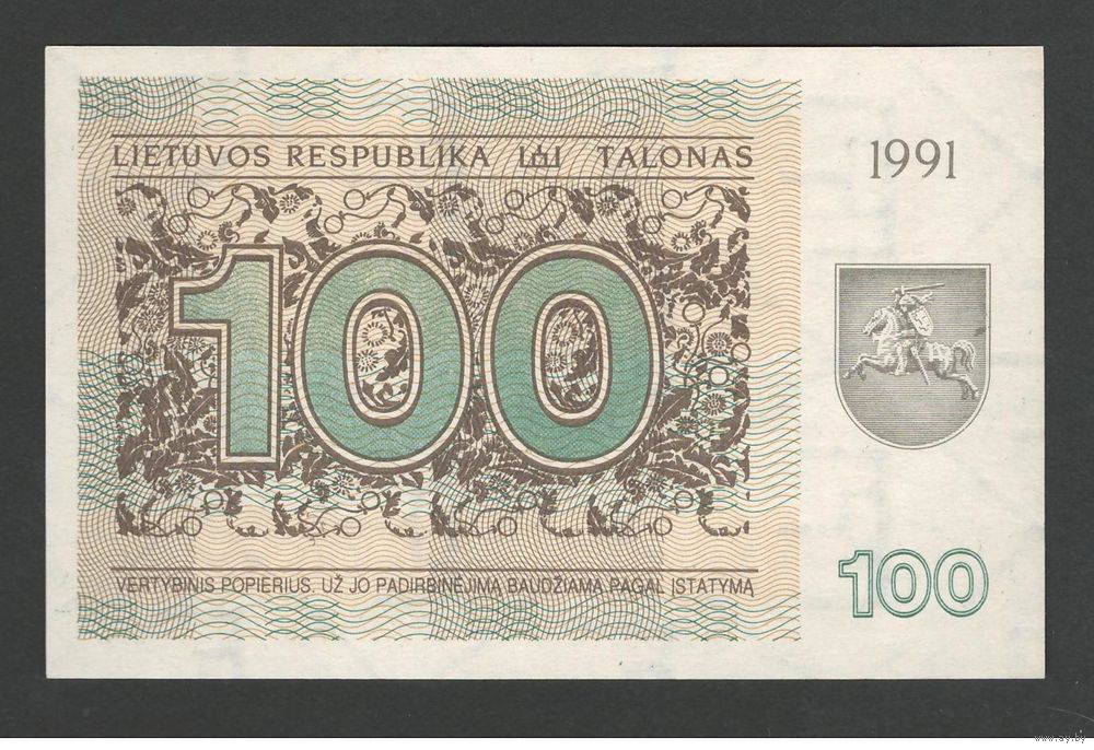 Литва 100 талонов 1991 года. С текстом. Тип Р-38b. Состояние UNC