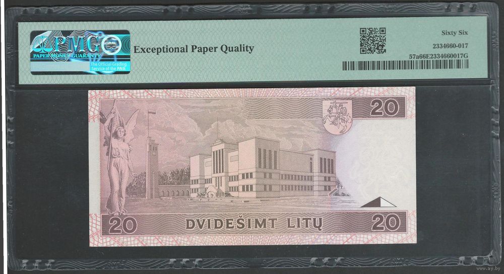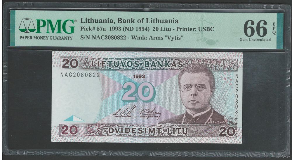 Литва 20 лит 1993 года. Тип Р-57а. Состояние UNC. В слабе PMG 66