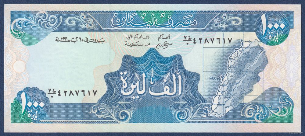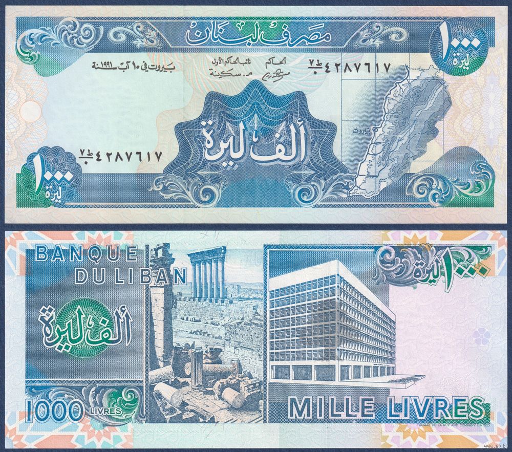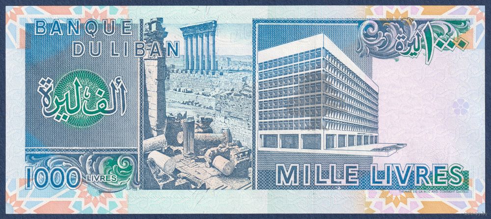 Ливан, 1000 ливров 1991 г, P-69b (колонны Баальбека, центробанк в Бейруте), UNC