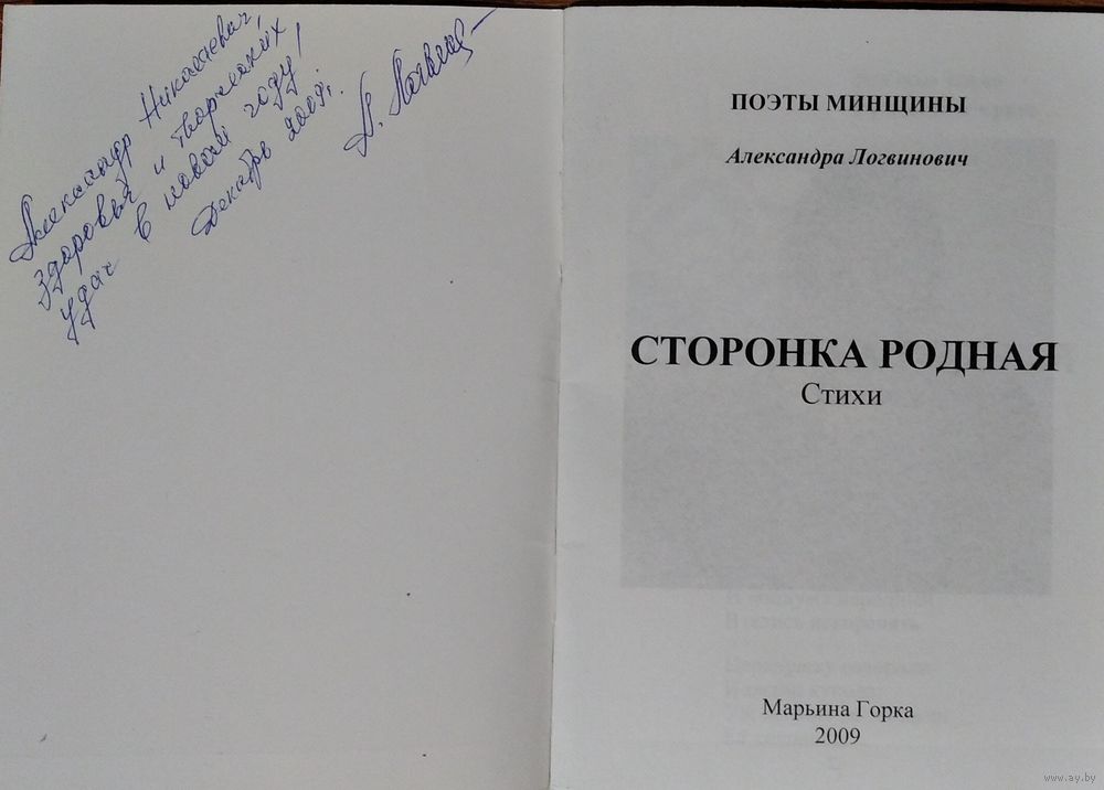 Логвинович Александра. Сторонка родная. Стихи. Автограф автора. Марьина Горка. 2009 г. 56 с. Мягкая обложка. Малый формат