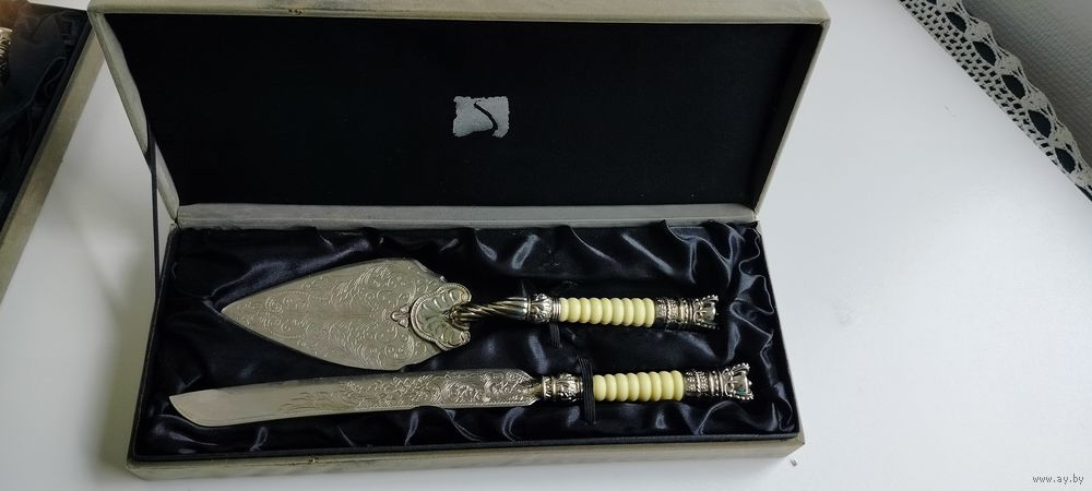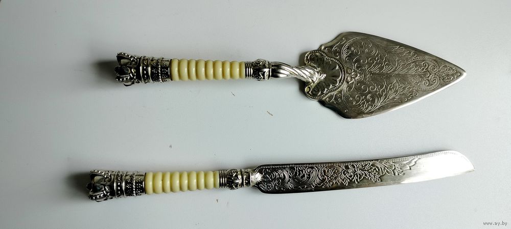 Винтажная лопатка с ножом для торта, красиво гравированная. Набор изготовлен из меди и покрыт серебром. Окончание рукояти украшено короной. Длина 29 см.