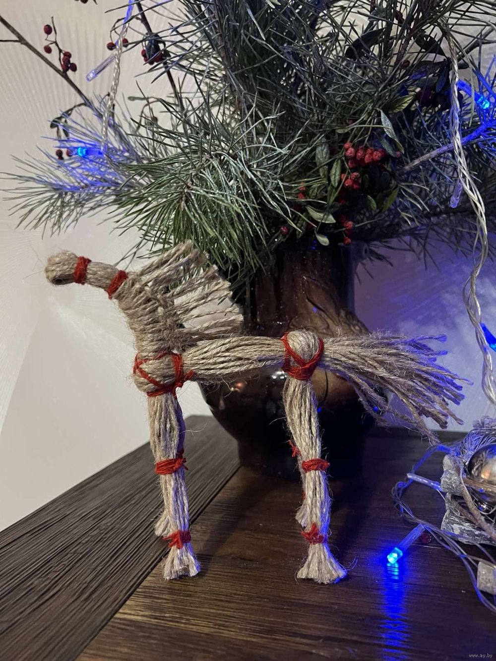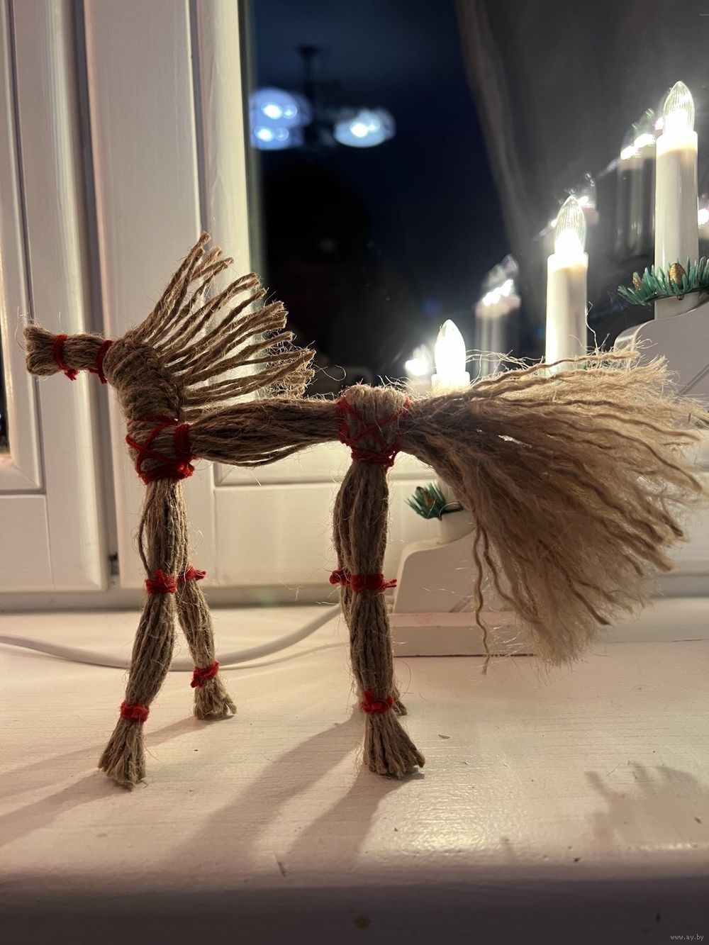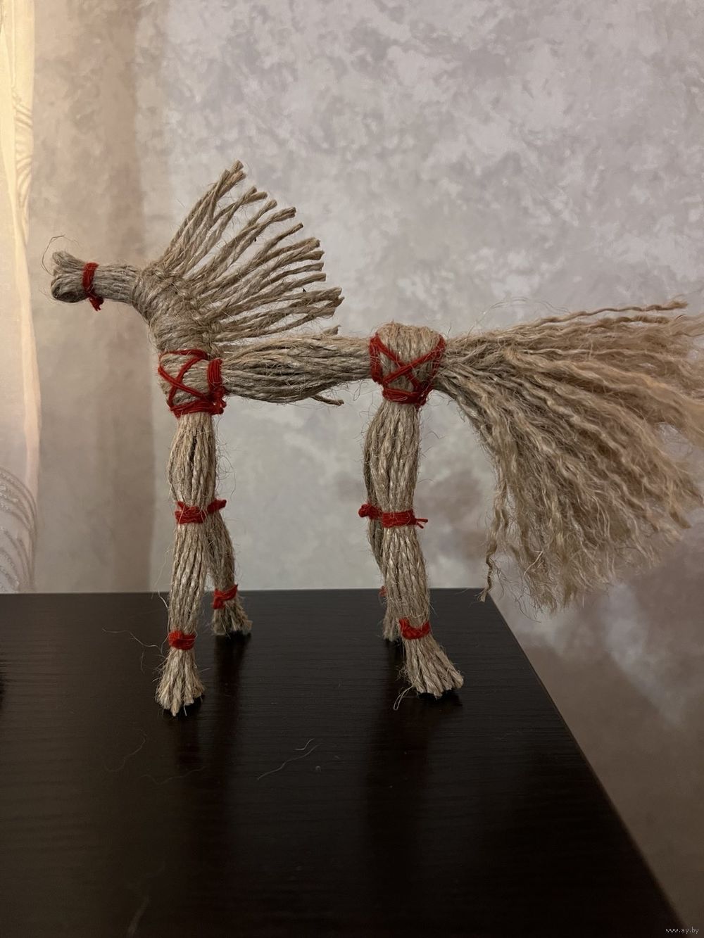 Лошадь выполнена в традиционном стиле из льняной и красной нитей.