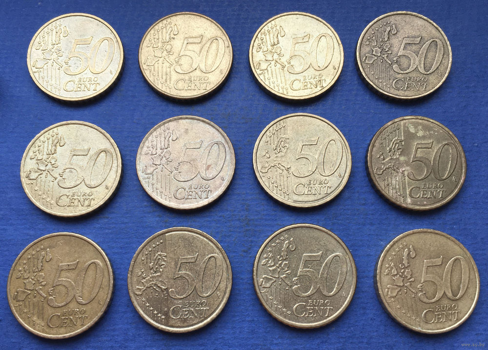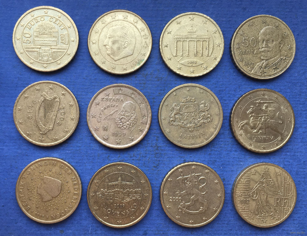 Лот 50 евроцентов (Австрия, Бельгия, Германия, Греция, Ирландия, Испания, Латвия, Литва, Нидерланды, Словакия, Финляндия, Франция). Всего 12 монет