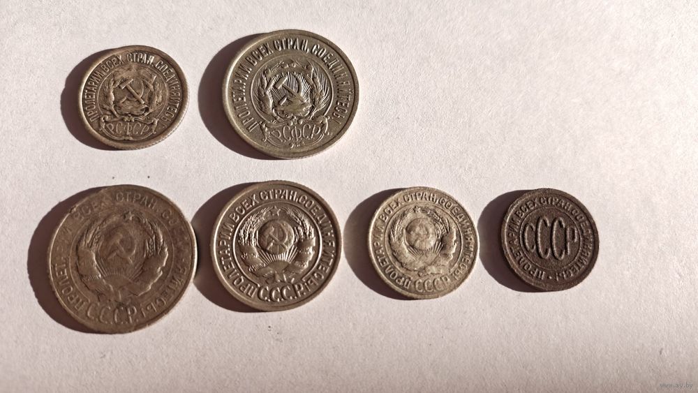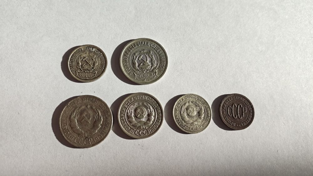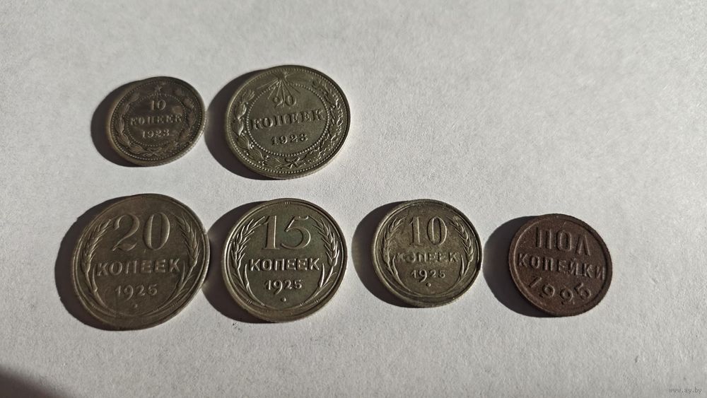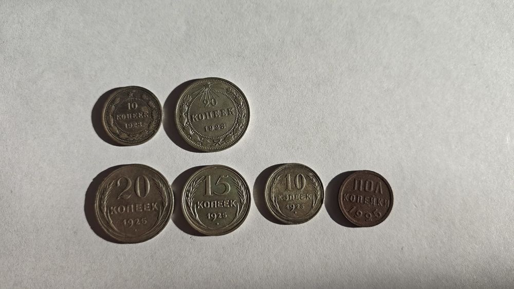 Набор билонов раннего СССР, 1923г 20 копеек и 10 копеек, 1925г 20 копеек ,15 копеек ,10 копеек и полкопейки
