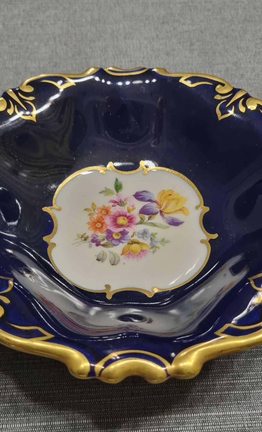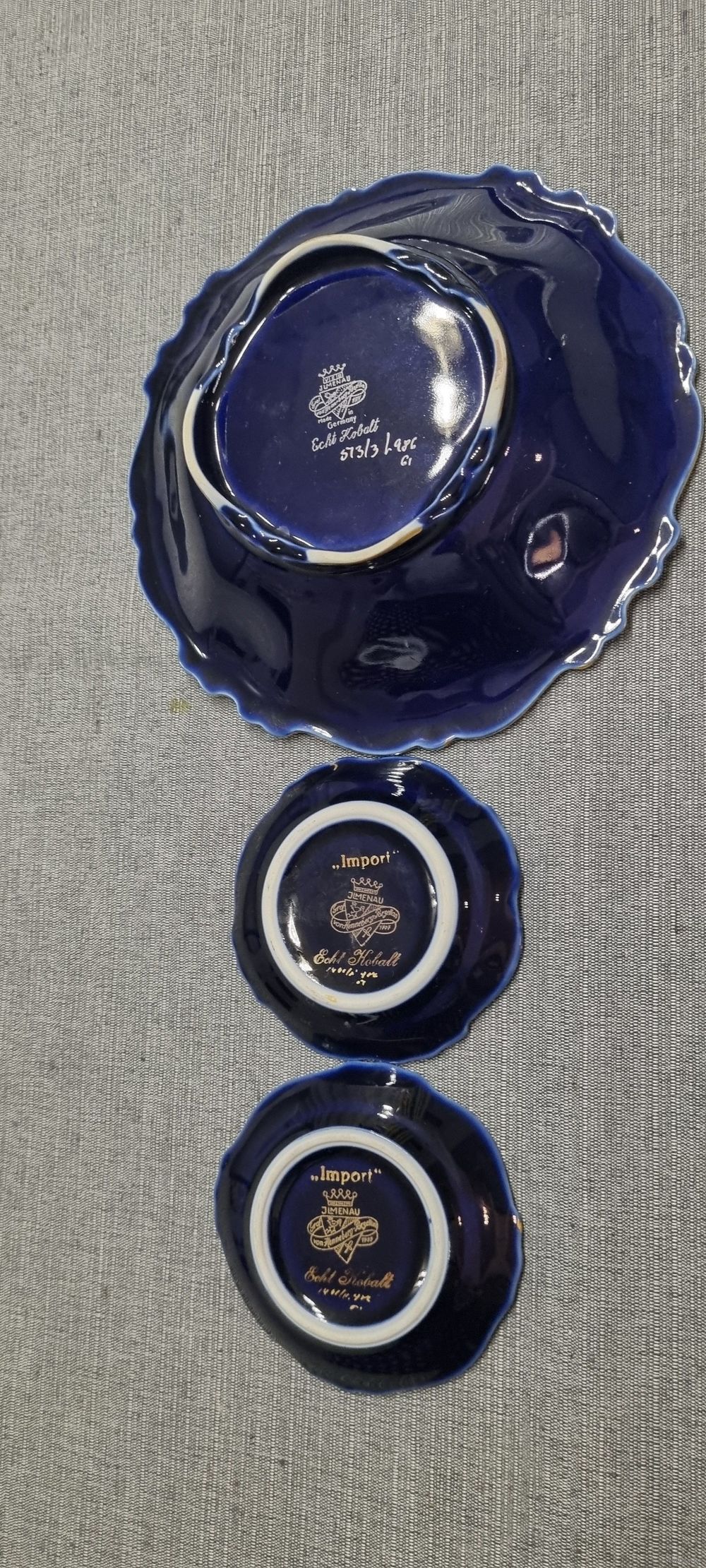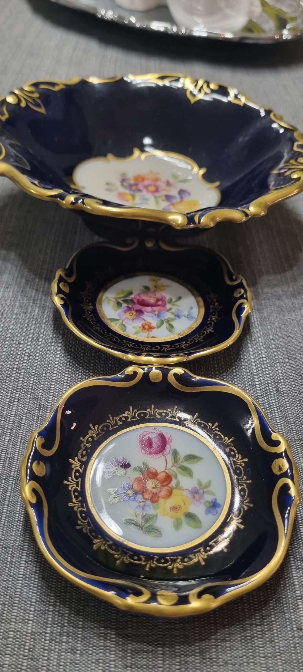 Фарфоровые тарелочки с синим кобальтовым глазурованием и золотой отделкой. Имеет волнистый край и золотую окантовку.