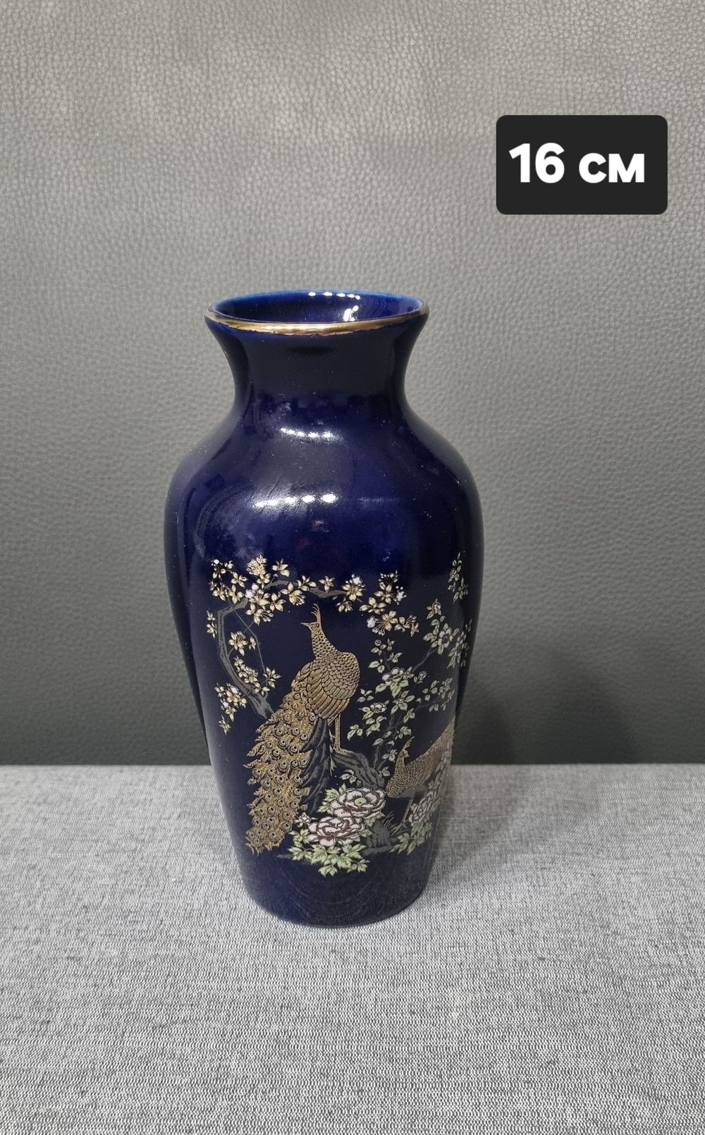 Кобальтово-синяя винтажная ваза с изображением павлинов и позолоченным цветочным декором.